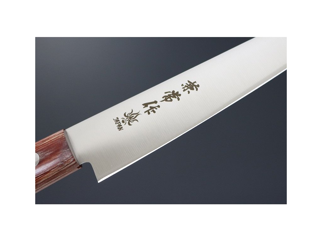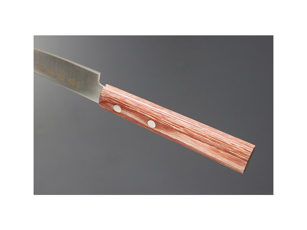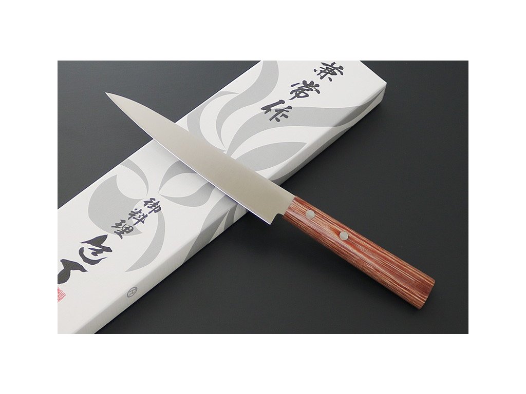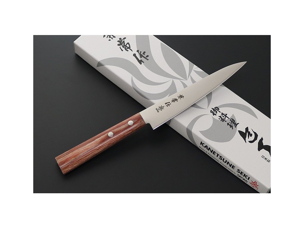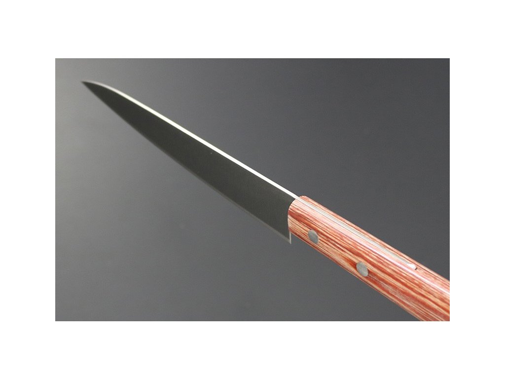 Japonský univerzální nůž Petty ze série Kanetsune 555-series s čepelí z nerezové oceli DSR-1K6, HRC 58-59. Klasická oválná rukojeť je vyrobena z Plywood. Délka ostří 135 mm.