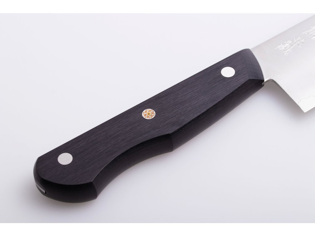 Západní rukojeť je vyrobena z černého materiálu Pakka-wood. Vždy je pečlivě ručně leštěná, ergonomicky tvarovaná a navržena pro vynikající ruční ovládání. Tento nůž je vhodný pro použití pravou i levou rukou. Mozaikový pin umístěný ve středu rukojeti působí japonským dojmem a je dokonalým designovým prvkem.