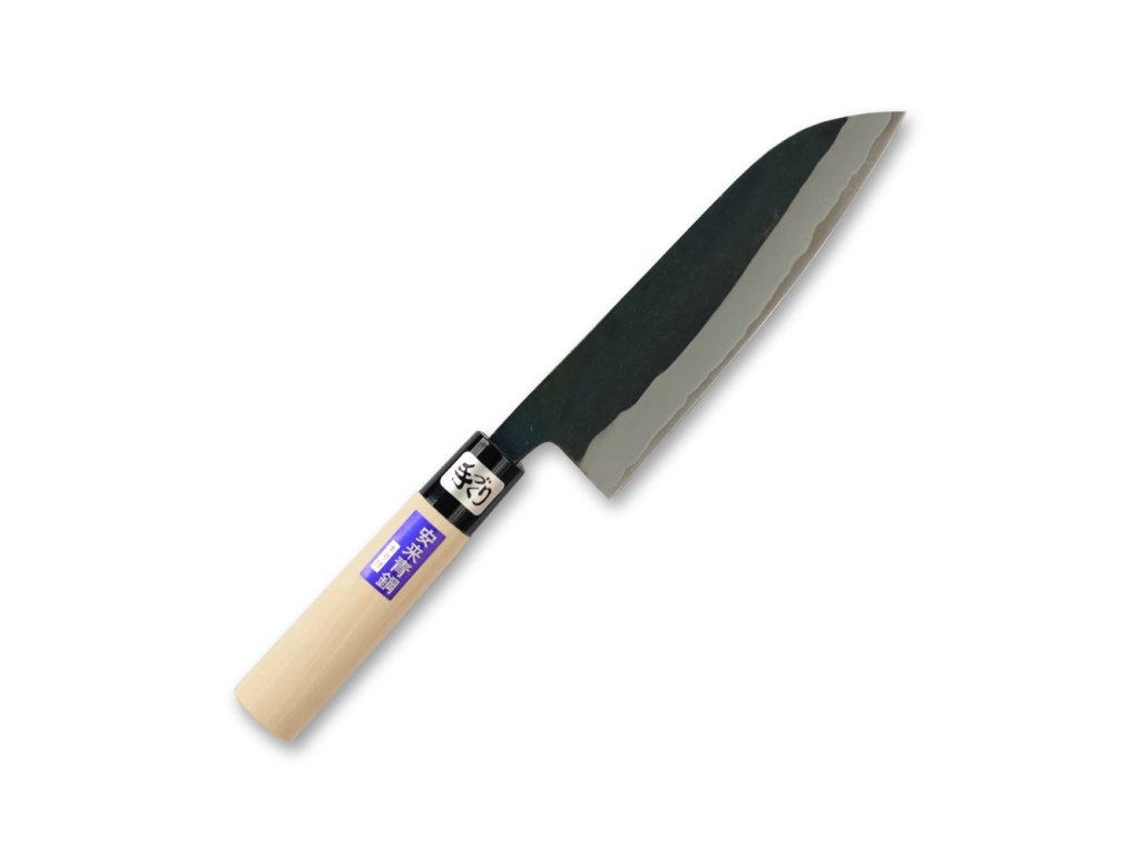 Japonský nůž šéfkuchaře Santoku ze série Kanetsune VARIOUS z oceli Blue Steel #2 w/iron, HRC 61-62. Rukojeť je vyrobena ze dřeva magnólie, bolster z plastu. Délka ostří 165 mm.