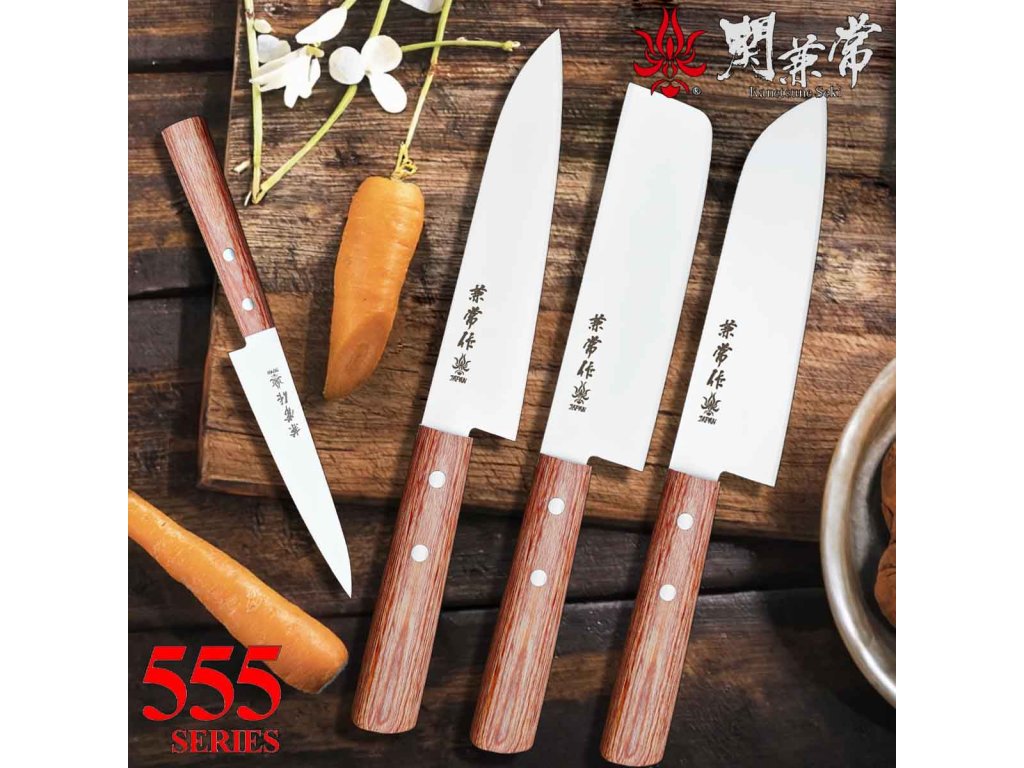 Japonský nůž šéfkuchaře Santoku/Chef ze série Kanetsune 555-series s čepelí z nerezové oceli DSR-1K6, HRC 58-59. Klasická rukojeť je vyrobena z Plywood. Délka ostří 165 mm.