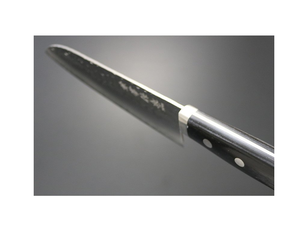Japonský nůž šéfkuchaře Santoku ze série Kanetsune Tsuchime VG-1 series s jádrem z VG-1 Stainless steel HRC 59-60, vloženým mezi nerezovou ocel SUS410, povrchová úprava Tsuchime "Mirror" polish. Klasická západní rukojeť z černého Plywood se třemi nýty, nerezový bolster. Délka ostří 165 mm.