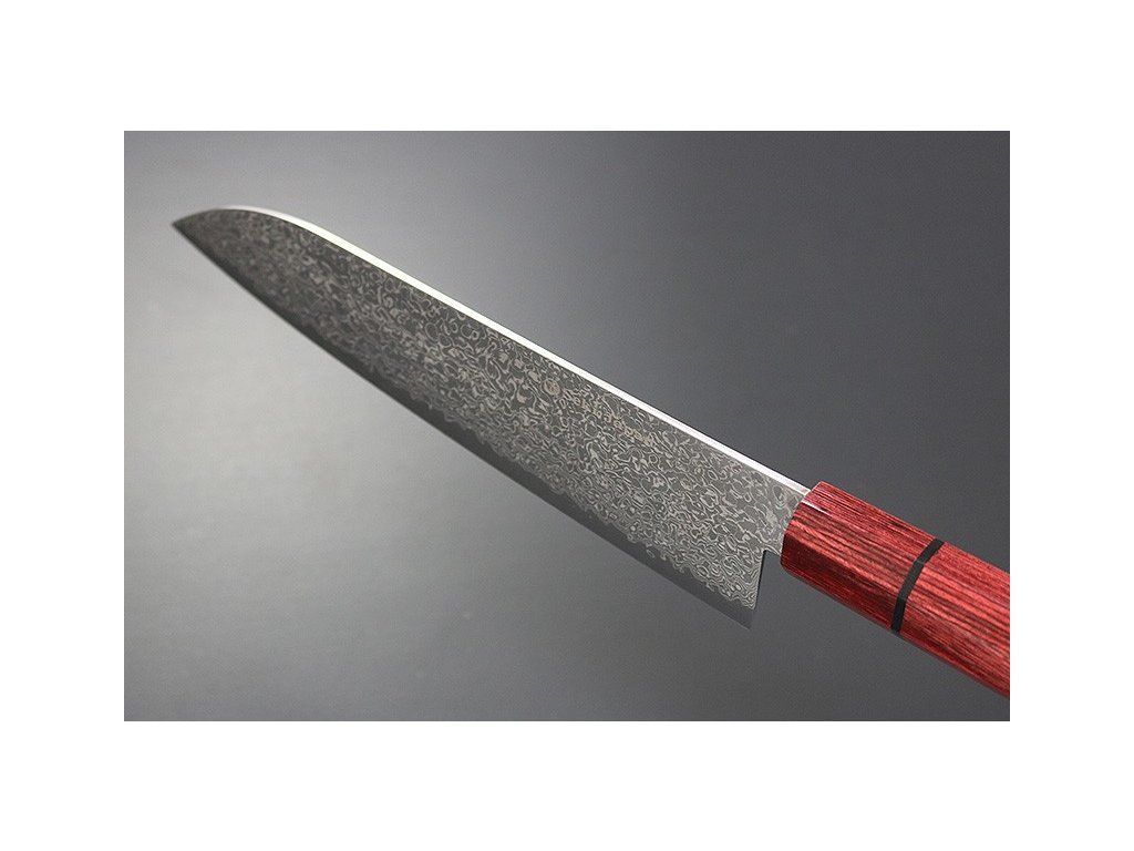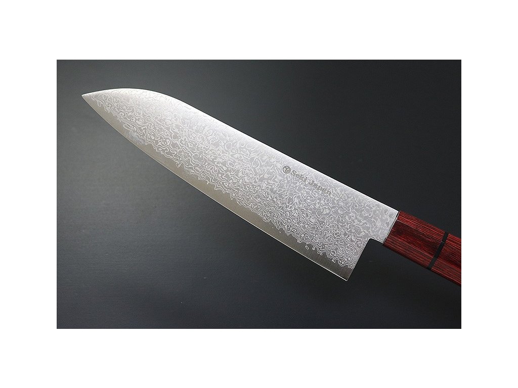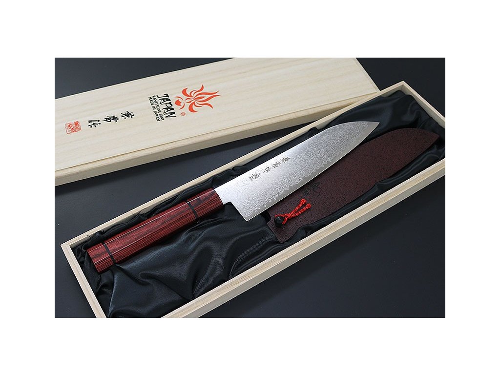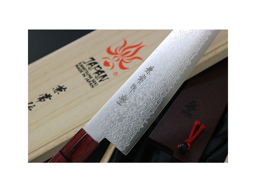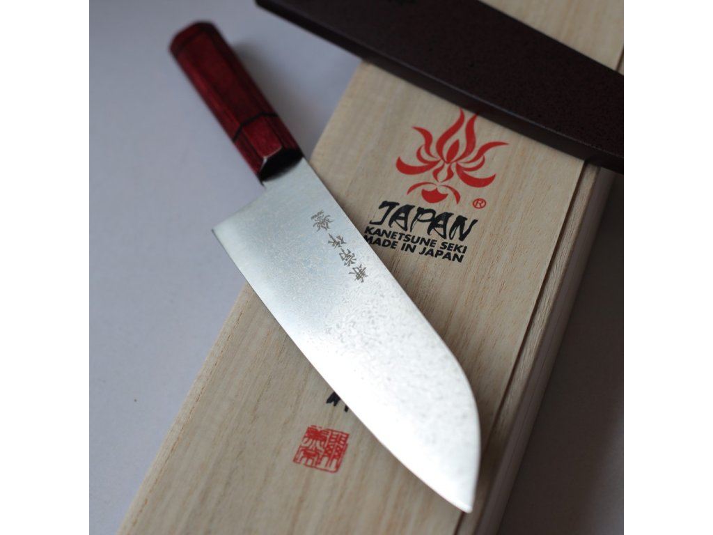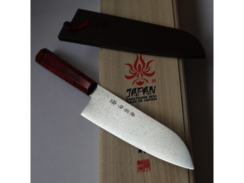 Japonský nůž šéfkuchaře Santoku ze série Kanetsune Damascus Minamo-Kaze series. Čepel nože je složena ze 63 vrstev damaškové oceli s jádrem z oceli s vysokým obsahem uhlíku o tvrdosti HRC 61 ± 0,5. Japonská tradiční oktagonová rukojeť z červeného Plywood, doplněna černou mikartou. Luxusní dřevěná krabice, japonská saya ze dřeva magnólie. Délka ostří 180 mm.