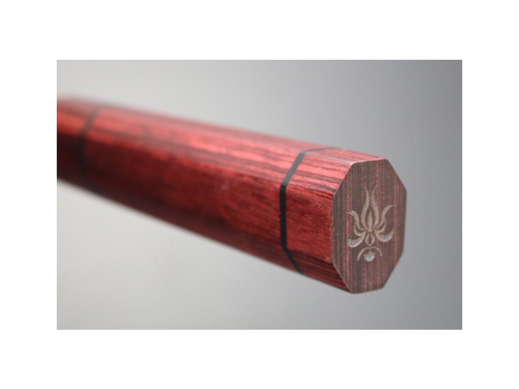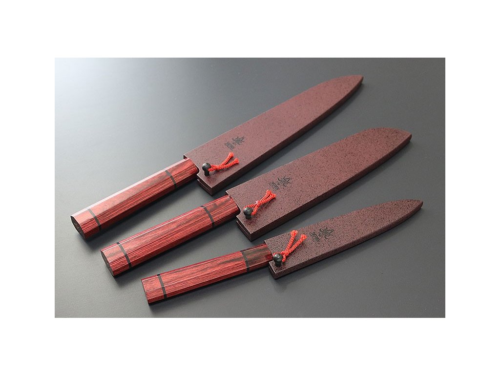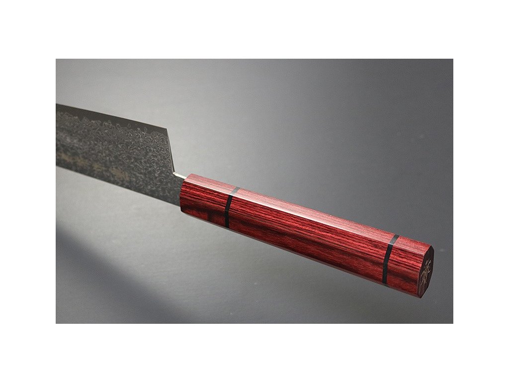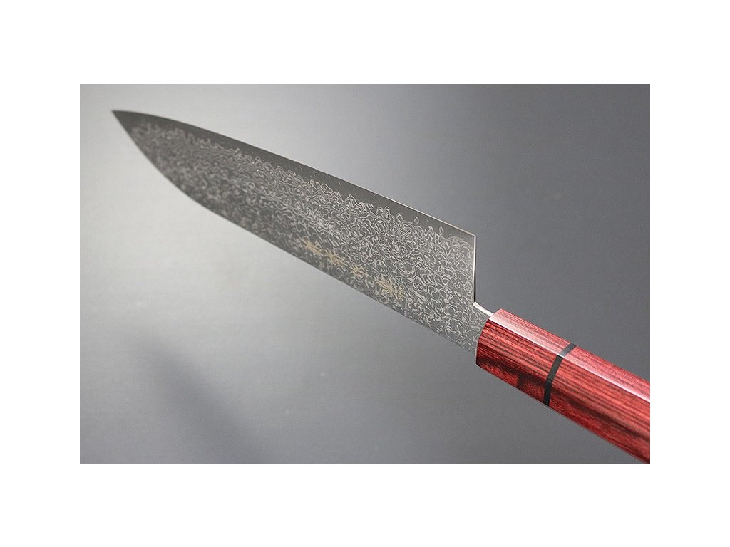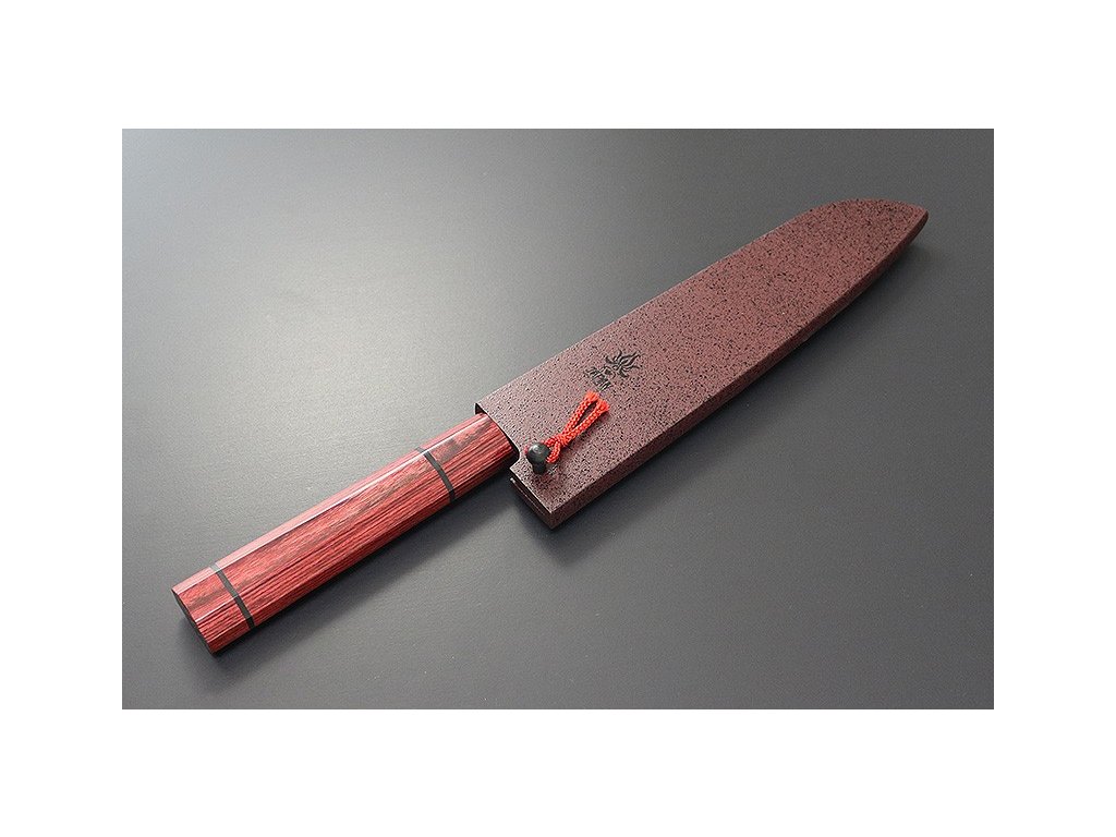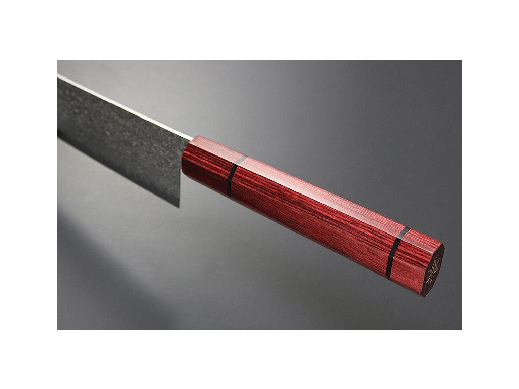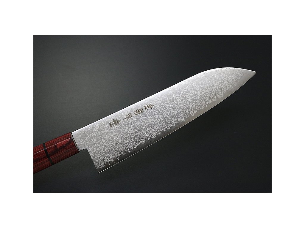 Japonský nůž šéfkuchaře Santoku ze série Kanetsune Damascus Minamo-Kaze series. Čepel nože je složena ze 63 vrstev damaškové oceli s jádrem z oceli s vysokým obsahem uhlíku o tvrdosti HRC 61 ± 0,5. Japonská tradiční oktagonová rukojeť z červeného Plywood, doplněna černou mikartou. Luxusní dřevěná krabice, japonská saya ze dřeva magnólie. Délka ostří 180 mm.
