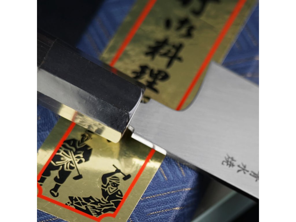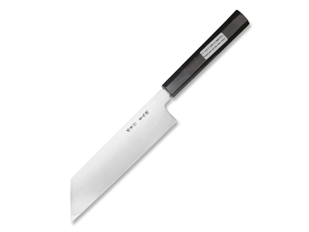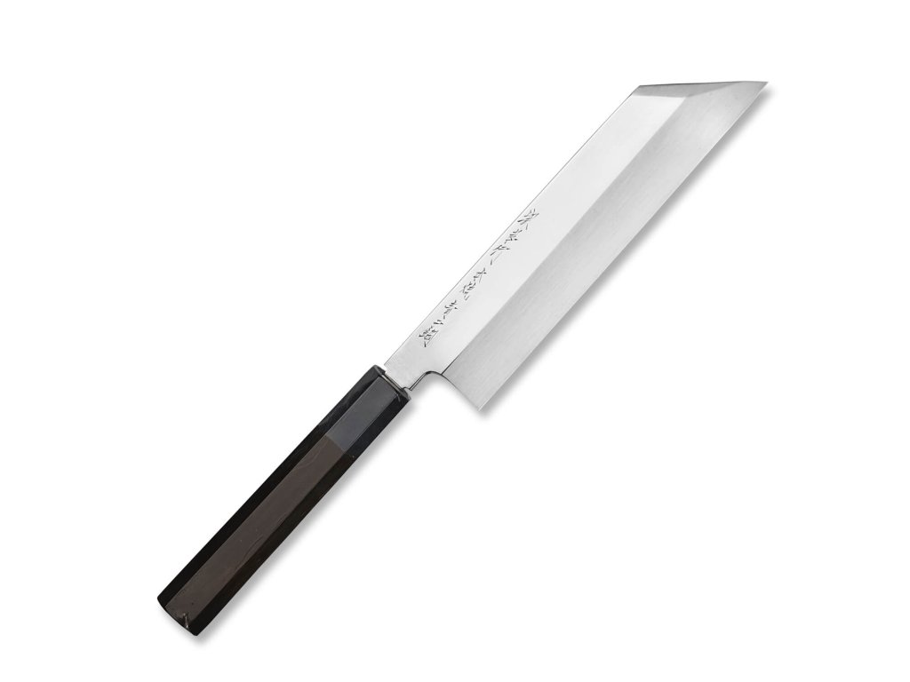 Japonský kuchařský nůž Mukimono od Sakai Takayuki s čepelí z oceli Yasuki Blue Steel #2 (HRC 61-62). Osmihranná rukojeť z ebenu s bolsterem z buvolího rohu pro perfektní vyvážení a komfortní úchop. Délka ostří 180 mm.