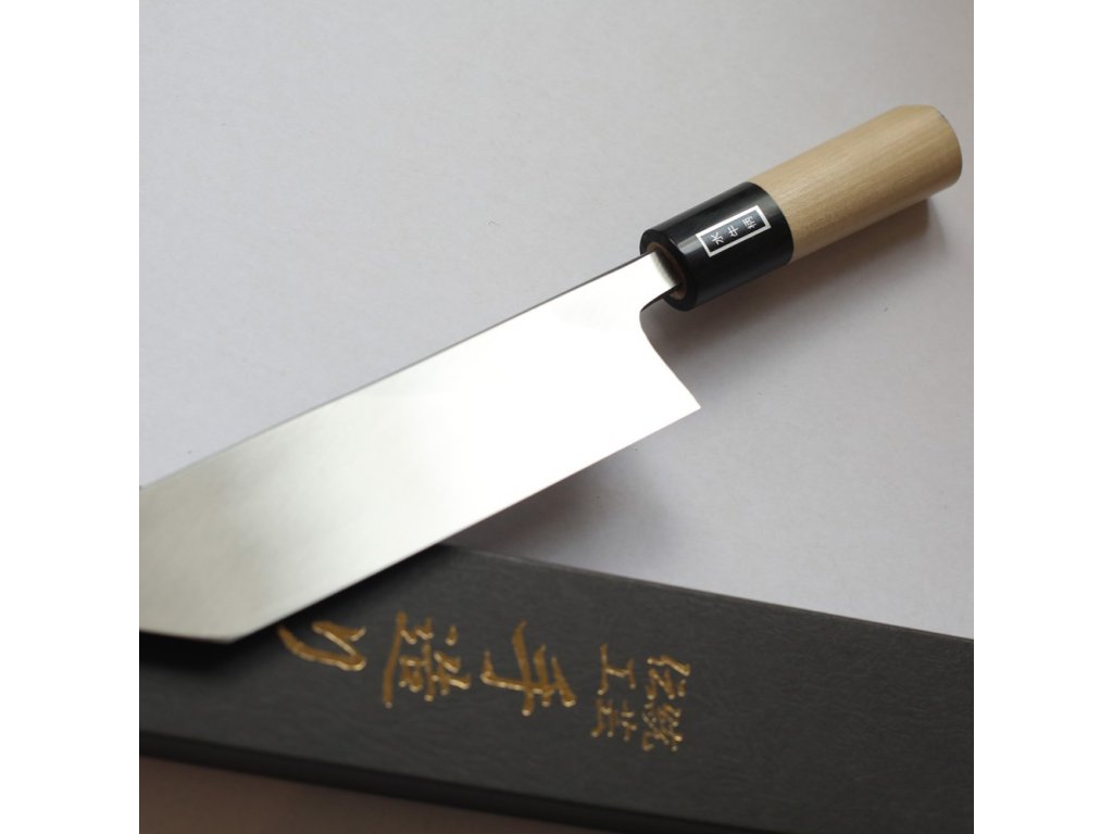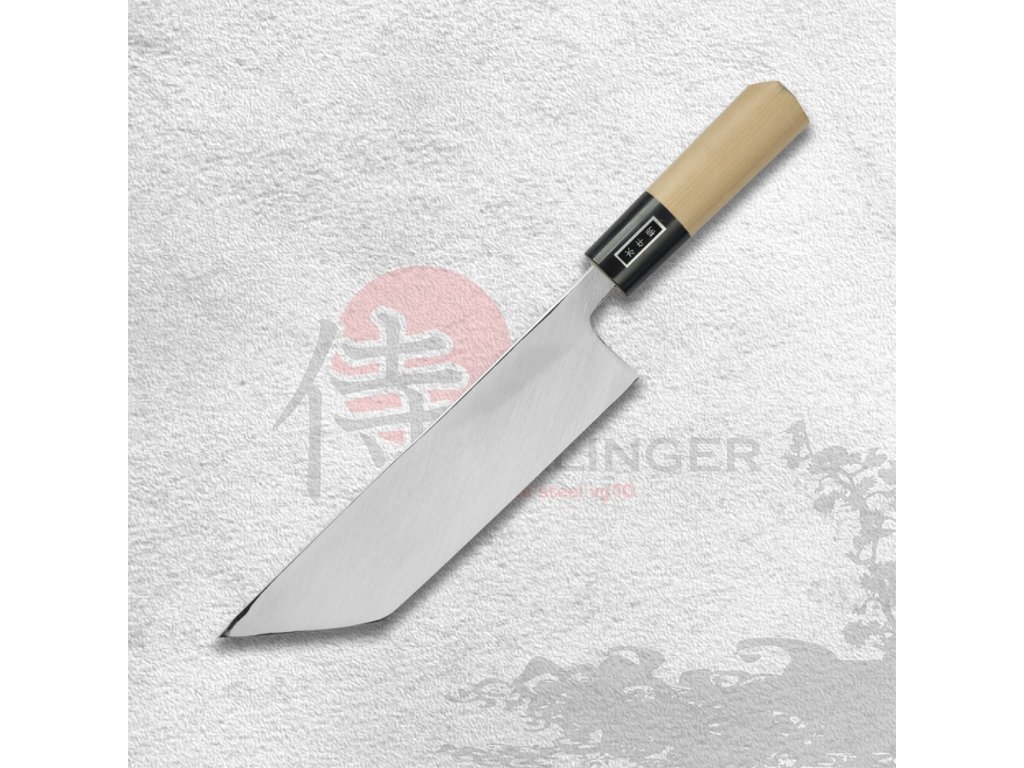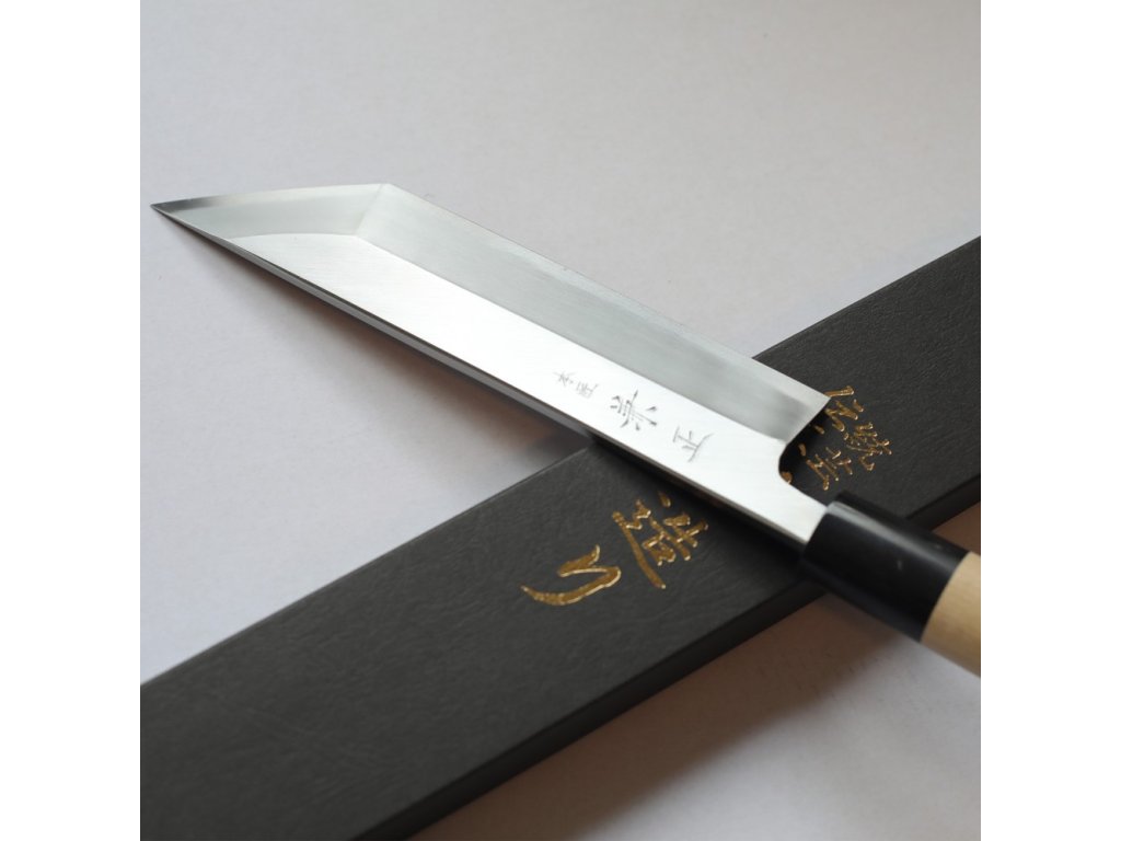 Extrémně ostrý japonský nůž Unagi-Saki ze série Kanetsune Honsho Kanemasa G-Series. Unagi znamená v japonštině úhoř. Špička nože je velmi ostrá, takže je ideální pro filetování ryb, zejména úhořů. K tomu slouží ostrý hrot nože, který se zasune do úhoře poblíž hlavy a poté se vede řez po celé délce úhoře tak, aby se dala snadno vyjmout páteř. Poté vám speciální tvar nože pomůže vytvořit požadované porce nebo filety. Pro tento typ nože je na první pohled typická krátká rukojeť, která se ideálně vejde do vaší dlaně.