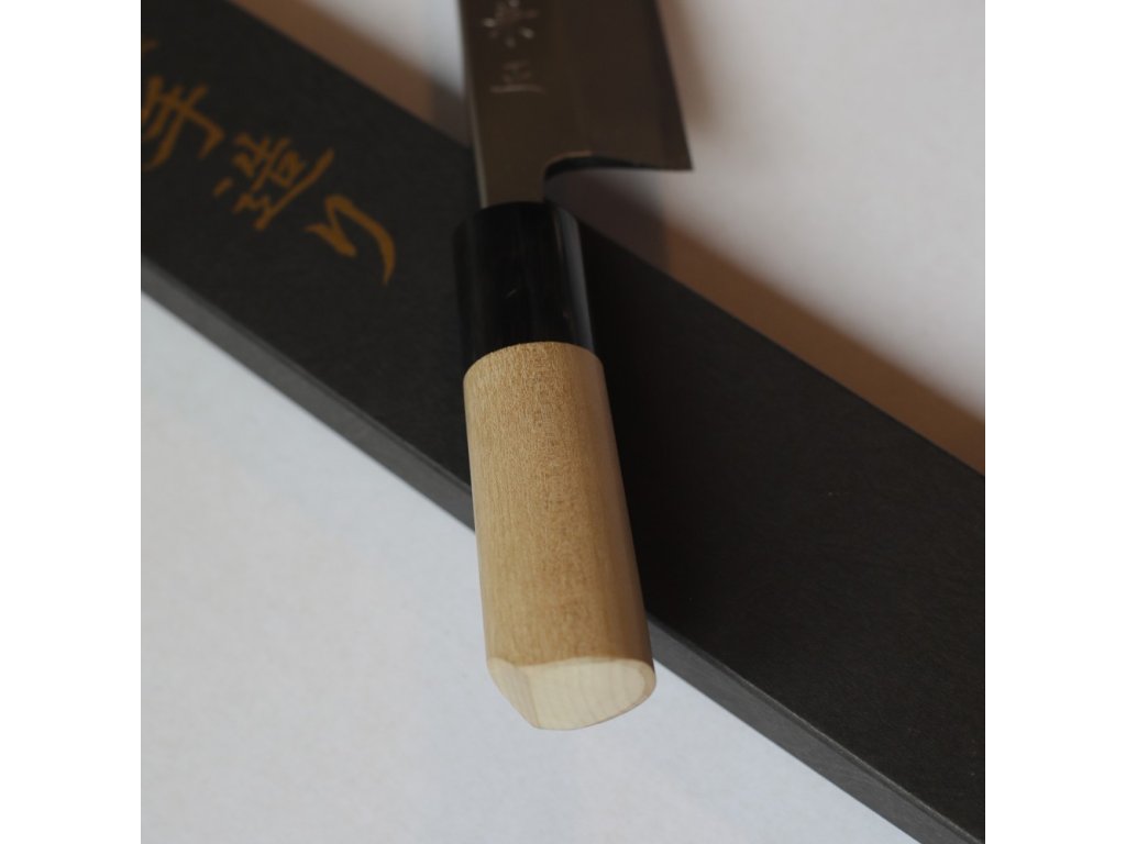 Japonský kuchařský nůž Unagi-Saki ze série Kanetsune Honso Kanemasa G-Series z oceli Hitachi White Steel #3 HRC 60-61, broušený jen z jedné strany, s rukojetí ve tvaru písmene D ze dřeva magnolie a bolsterem z bůvolího rohu. Prioritně určen pro držení v pravé ruce. Délka ostří 180 mm.