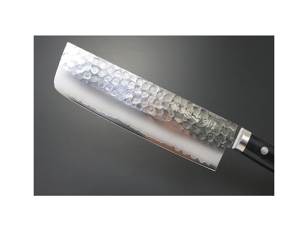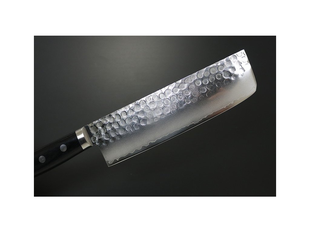 Velmi ostrý japonský nůž Nakiri/Usubagata ze série Kanetsune Tsuchime VG-1 series s jádrem z VG-1 Stainless steel vloženým mezi nerezovou ocel SUS410, povrchová úprava Tsuchime "Mirror" polish. Svým tvarem nůž připomíná sekáček na maso, ale nenechte se mýlit. Snadno nakrájíte veškerou zeleninu na drobné kostičky nebo proužky. Výška nože vám pak umožní nakrájenou surovinu jednoduše nabrat na čepel a přenést do hrnce či pánve. Vysoká čepel a klasická rukojeť z Plywood poskytne ideální kontrolu při řezání a krájení. Japonská preciznost a nové technologie činí tento nůž z nerezové oceli VG-1 Stainless steel core/SUS410 Stainless steel jedinečným a ideálním jak pro domácí, tak profesionální použití.