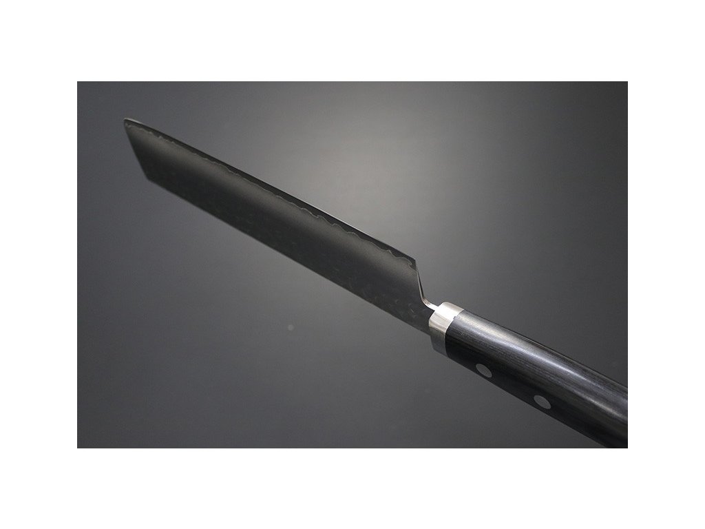 Japonský kuchařský nůž Nakiri/Usubagata ze série Kanetsune Tsuchime VG-1 series s jádrem z VG-1 Stainless steel HRC 59-60, vloženým mezi nerezovou ocel SUS410, povrchová úprava Tsuchime "Mirror" polish. Klasická západní rukojeť z černého Plywood se třemi nýty, nerezový bolster. Délka ostří 165 mm.
