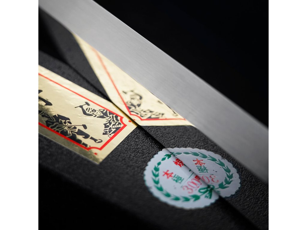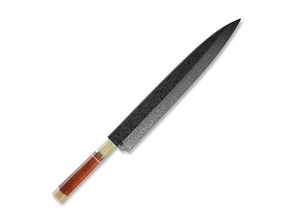 Japonský nůž Yanagiba od Sakai Takayuki určený pro krájení a plátkování masa a ryb. Čepel z uhlíkové oceli White Steel Mirror pro maximální ostrost. Rukojeť z Rose-wood s bolsterem z buvolího rohu světlé barvy. Délka ostří 300 mm.