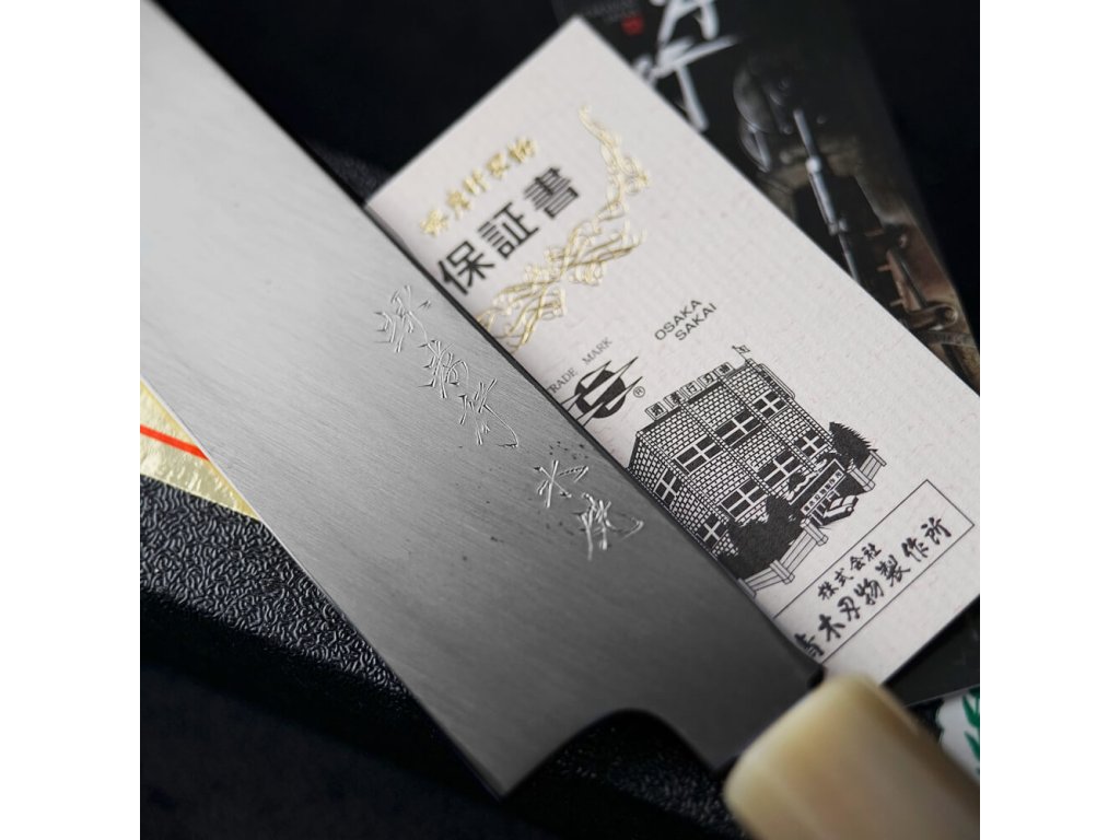 Nůž je dodávaný s praktickým dřevěným pouzdrem z měkkého dřeva, které je odolná vůči vlhkosti a neobsahuje pryskyřici. Saya zabrání poškození nože během přepravy.