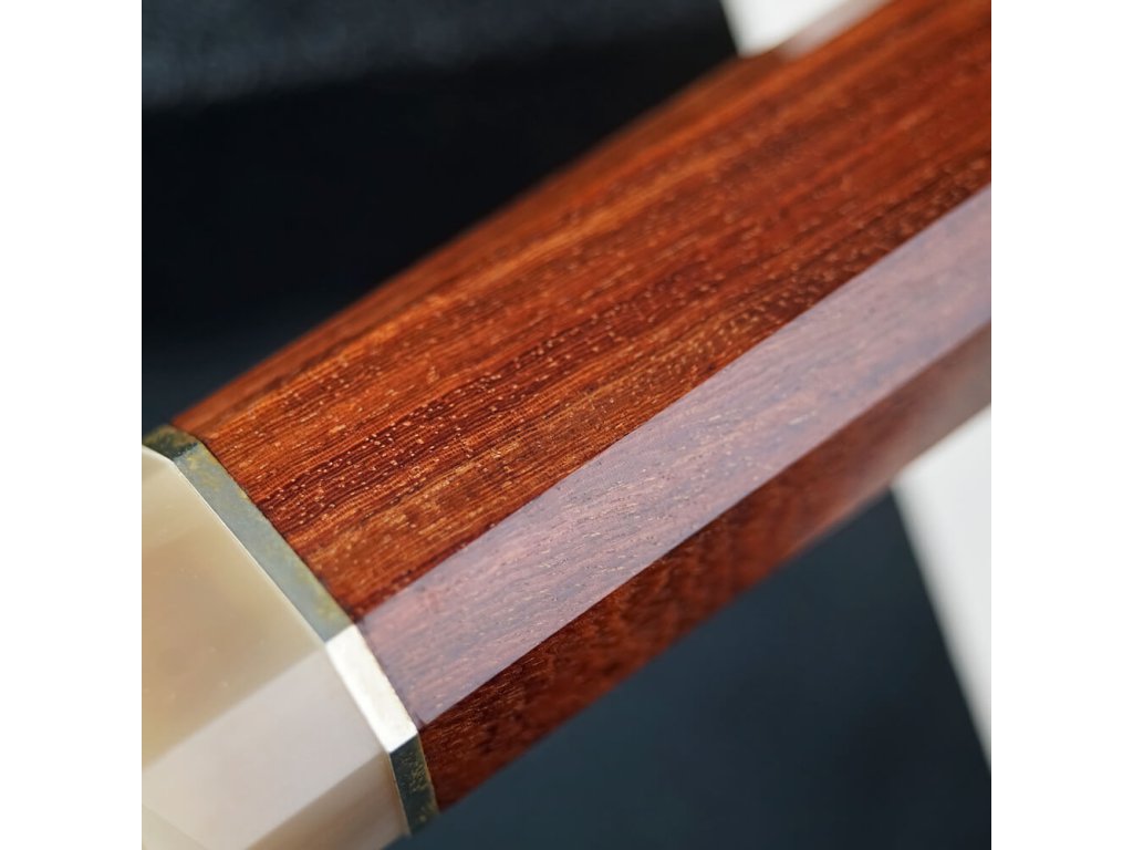 Rukojeť ve tvaru oktagonu je vyrobena z elegantního dřeva Rose-wood se zakončením (bolstrem) z pravého bůvolího rohu světlé barvy. Dřevo Rose-wood je exotický druh dřeva, které má červenohnědou barvu s fialovými podtóny. V kombinaci s buvolím rohem vypadá rukojeť opravdu překrásně. Rukojeti jsou navrženy tak, aby dokonale padly do ruky a poskytovaly pohodlí. Nože jsou dokonale vyvážené a zabraňují únavě rukou. Tím je zajištěna maximální kontrola a přesnost.