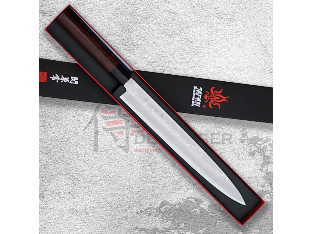 Japonský ostrý nůž Yanagiba ze série Kanetsune KC-400 Series s jádrem z oceli White steel #2 core, HRC 60-61, vložené mezi 11 vrstev damaškové oceli. Rukojeť ve tvaru písmene "D" je vyrobena z červeného santalového dřeva, bolster z černého dřeva Plywood. Délka ostří 270 mm.