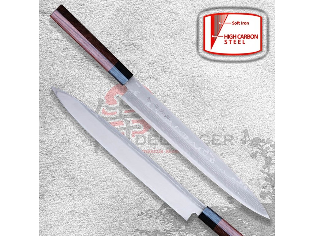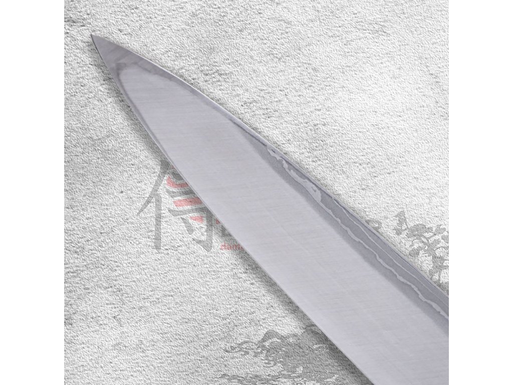 Jádro čepele těchto nožů je kované z vysoce uhlíkové oceli White Steel #2. Tato ocel díky tomu, že je legovaná chromem a wolframem, má vynikající retenci ostří a odolnost. Je velmi oblíbená u japonských výrobců nožů. Tvrdost nože je 60-61 HRC. Nádherná damašková čepel je složená z 11 vrstev a mimořádně ostrého řezného jádra. Čepel je osazena tradiční japonskou rukojetí ve tvaru písmene „D“ z červeného santalového dřeva, bolster je z černého dřeva Plywood.
