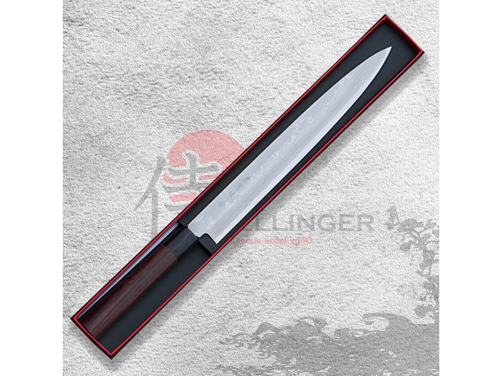 Extrémně ostrý nůž Yanagiba ze série Kanetsune White Steel KC-400 series je vyroben z oceli White steel #2 core, 11 layers damascus. Je to dlouhý krájecí nůž broušený jen z jedné strany, určený k řezání tenkých plátků ryb pro sushi a sashimi. S tímto nožem snadno nakrájíte velké kusy masa (pečeně), ale i tenké plátky zeleniny. Jeho překrásná elegantní tenká čepel je schopna řezat přísady v dlouhých nepřerušovaných řezech a tím zachovat jejich celistvost a svěžest. Yanagiba je jedním z nejdůležitějších tradičních japonských nožů a je součástí repertoáru mnoha kuchařů. Dokonce i nejjednodušší úkoly s tímto krásným a funkčním nožem jsou povýšeny na mimořádný zážitek. Japonské umění, preciznost a nové technologie činí tento nůž z damaškové oceli jedinečným a nenapodobitelným.