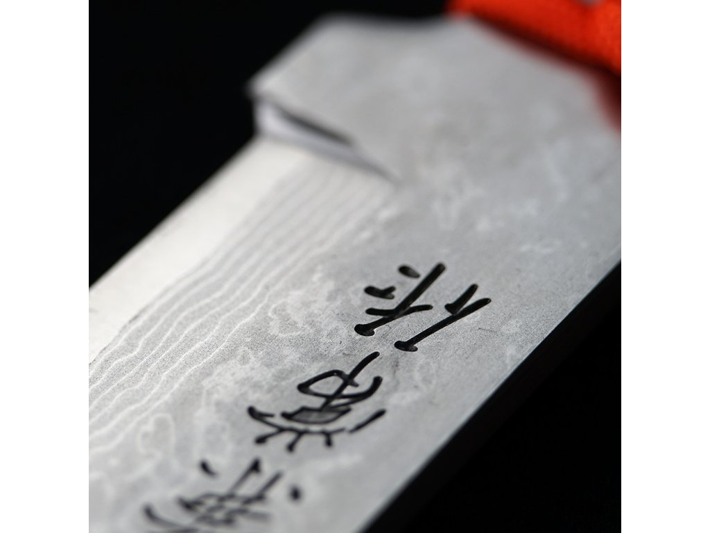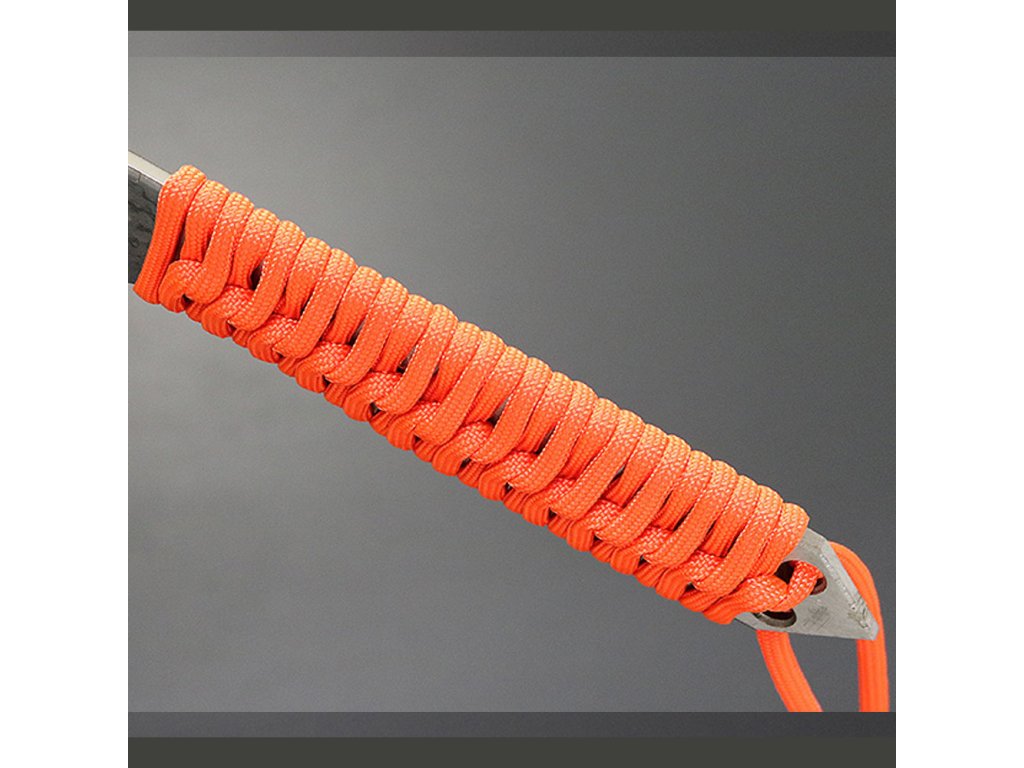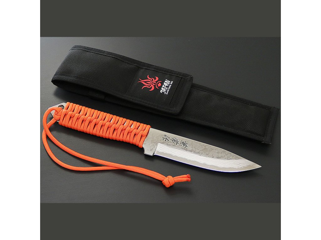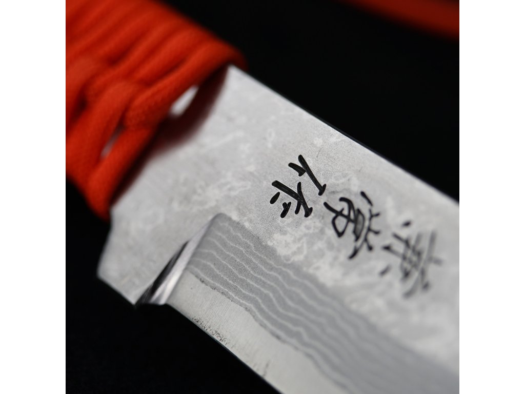 Bojový japonský nůž Kanetsune Shu-Karasu s pevnou čepelí z 15-vrstvé damaškové oceli Blue Steel #2. Oranžový paracord, pohotovostní hrot na rozbíjení skla a nylonové pouzdro. Vyrobeno v japonském Seki.