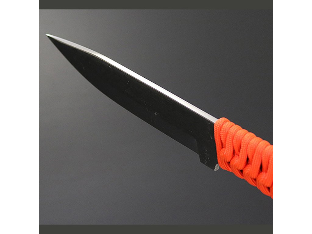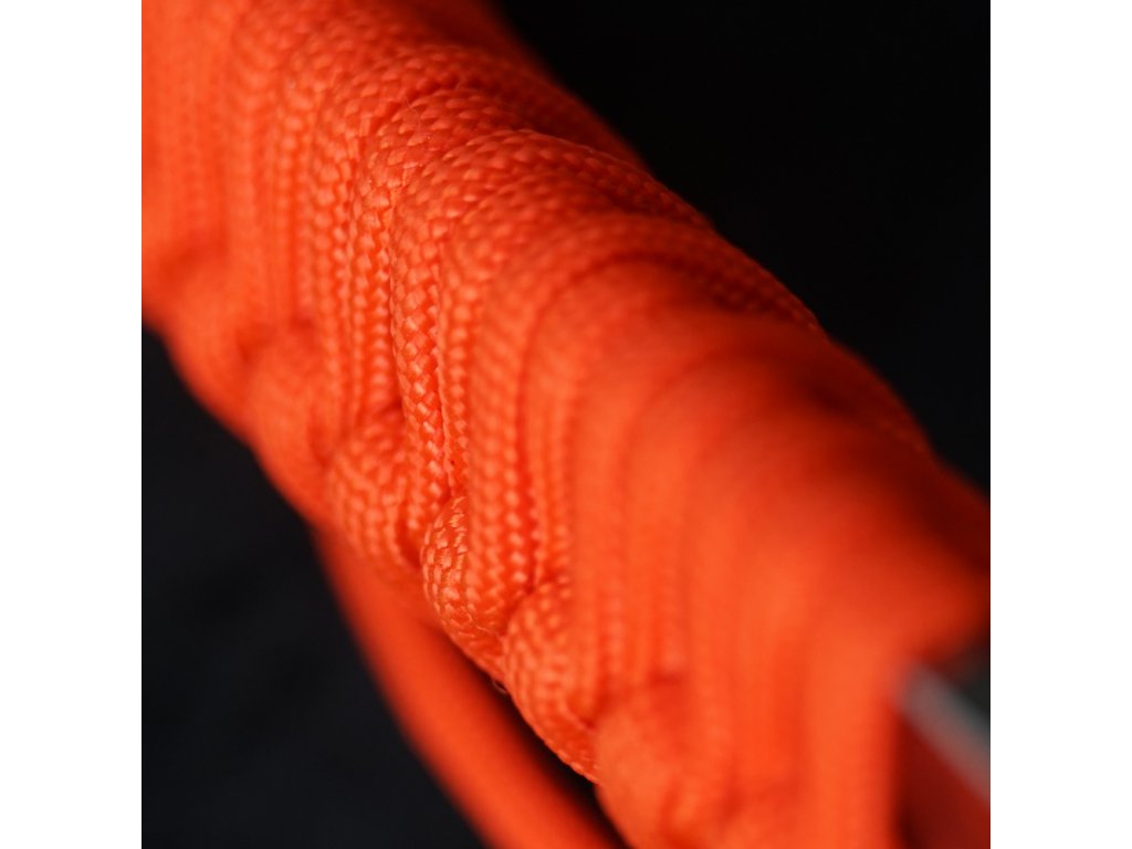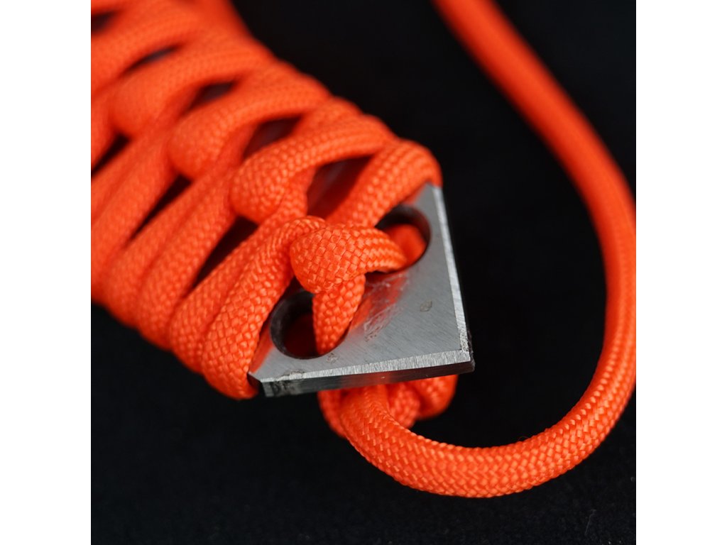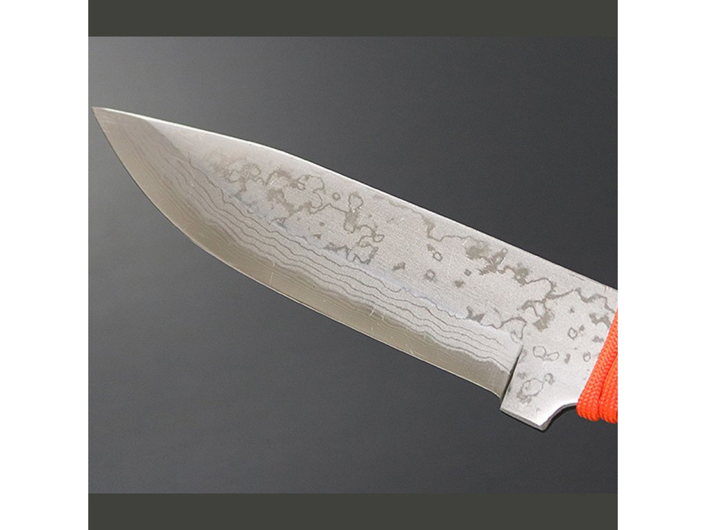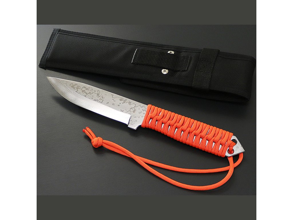 Bojový japonský nůž Kanetsune Shu-Karasu s pevnou čepelí z 15-vrstvé damaškové oceli Blue Steel #2. Oranžový paracord, pohotovostní hrot na rozbíjení skla a nylonové pouzdro. Vyrobeno v japonském Seki.
