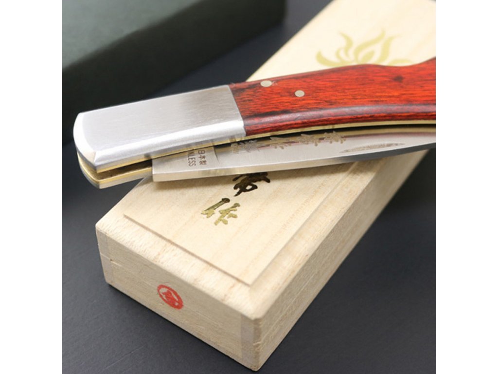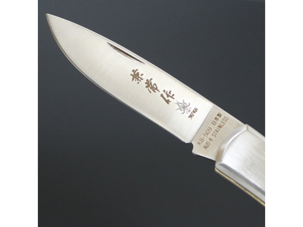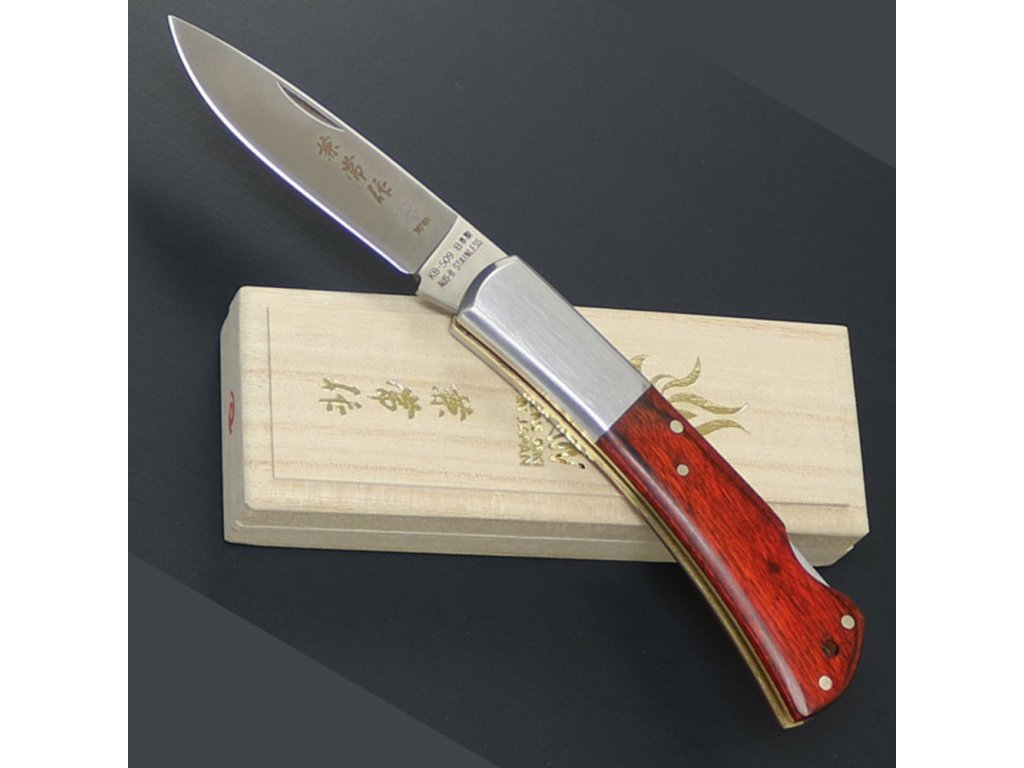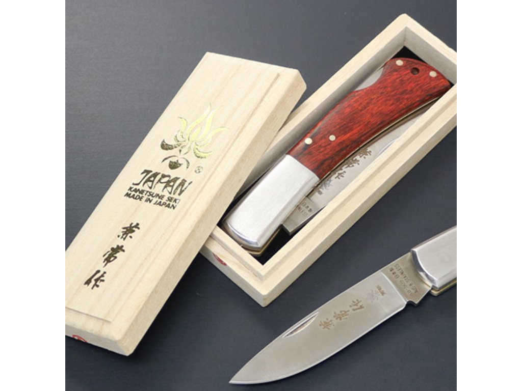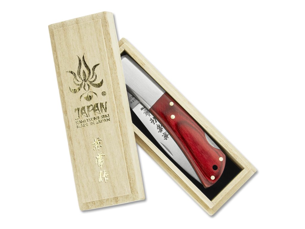 Lovecký zavírací nůž Kanetsune Kaico-Tou s čepelí z japonské oceli AUS-8, dřevěnou rukojetí z Plywood s nerezovým bolsterem a pojistkou Back-Lock. Nůž je dodáván v dárkové krabičce z přírodního dřeva.