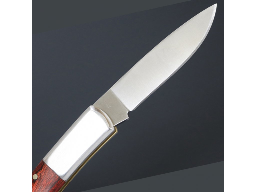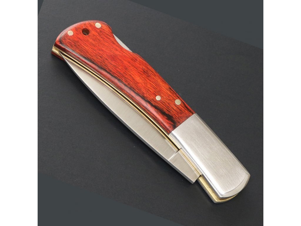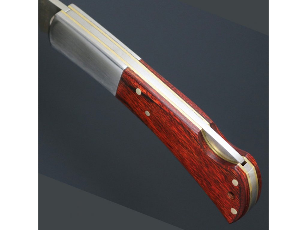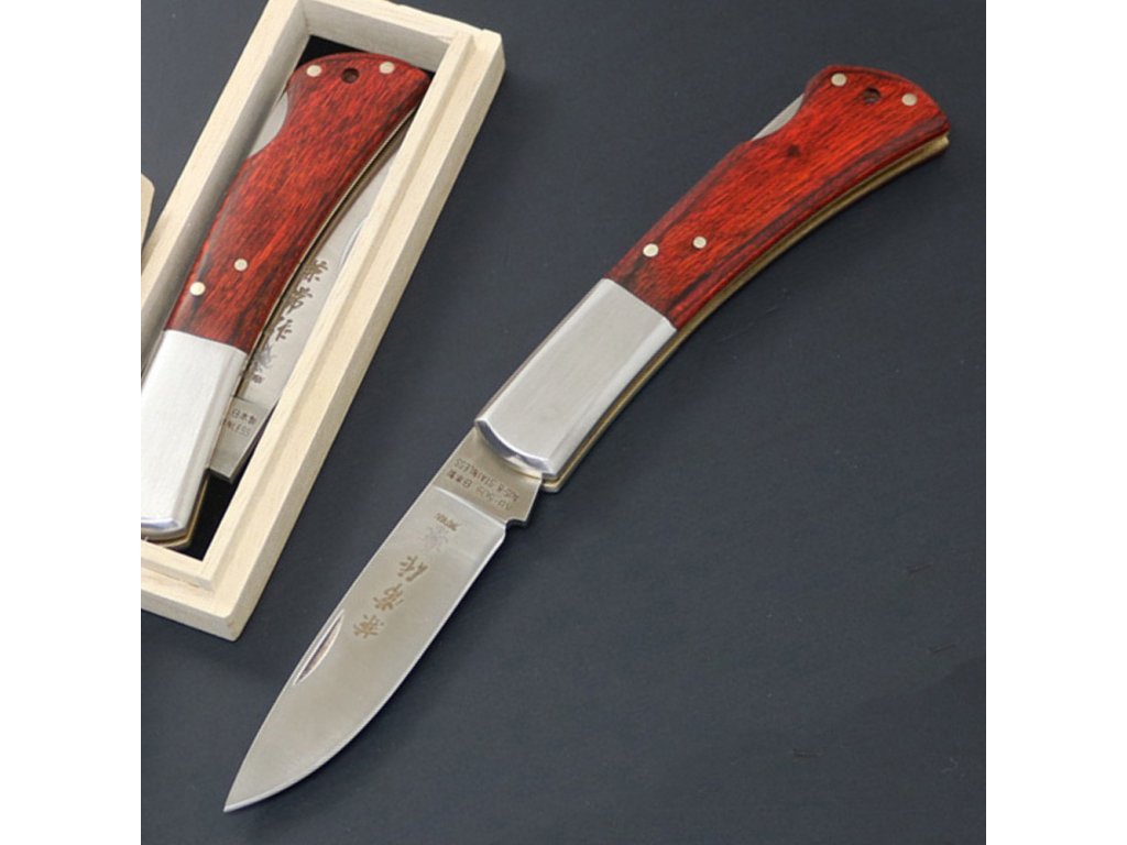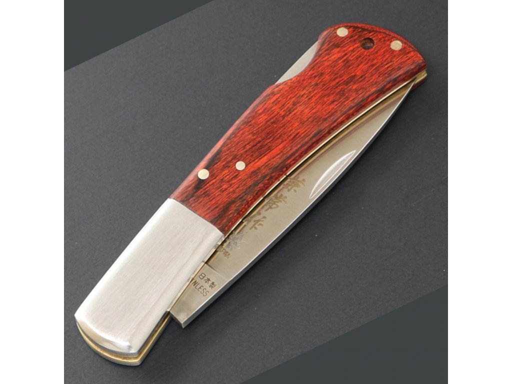 Lovecký zavírací nůž Kanetsune Kaico-Tou s čepelí z japonské oceli AUS-8, dřevěnou rukojetí z Plywood s nerezovým bolsterem a pojistkou Back-Lock. Nůž je dodáván v dárkové krabičce z přírodního dřeva.