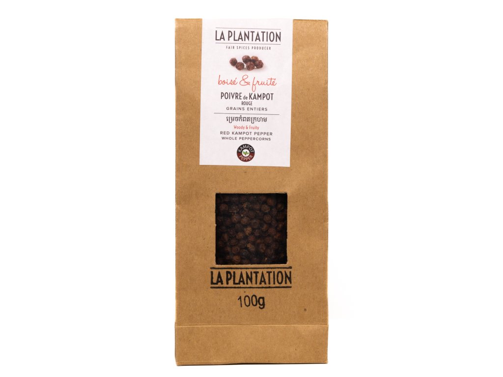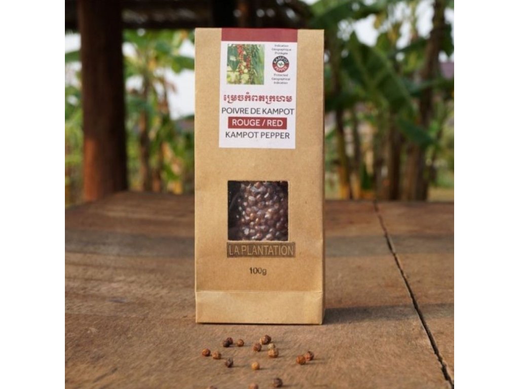 Do červena vyzrálý Kampotský pepř. Ručně sbíraný, ručně tříděný. Ovocně nasládlá chuť s tóny jahod. Tyto jemné unikátní chutě podporuje i 2-3 denní sušení na kambodžském slunci. Červený pepř má nižší pikantnost na rozdíl od černého pepře. Je nakupován v rámci Fair Trade a má PGI certifikát původu.
