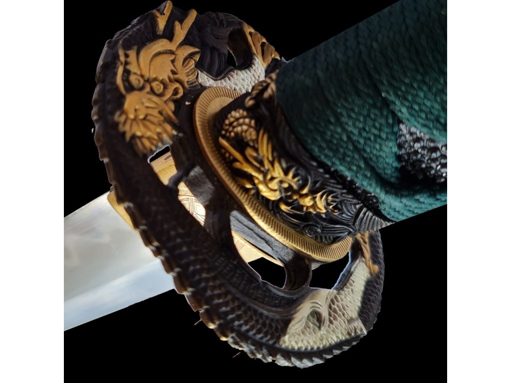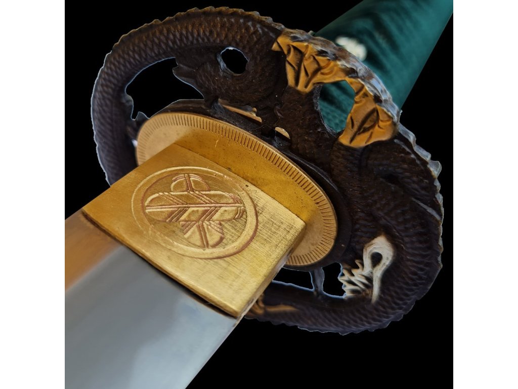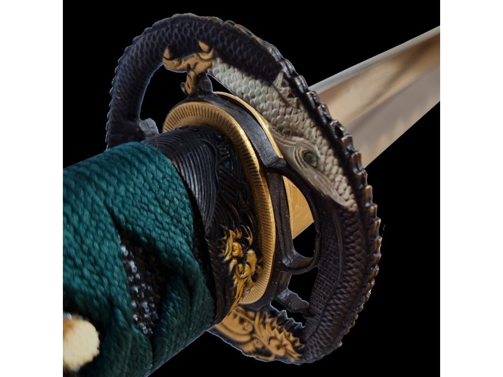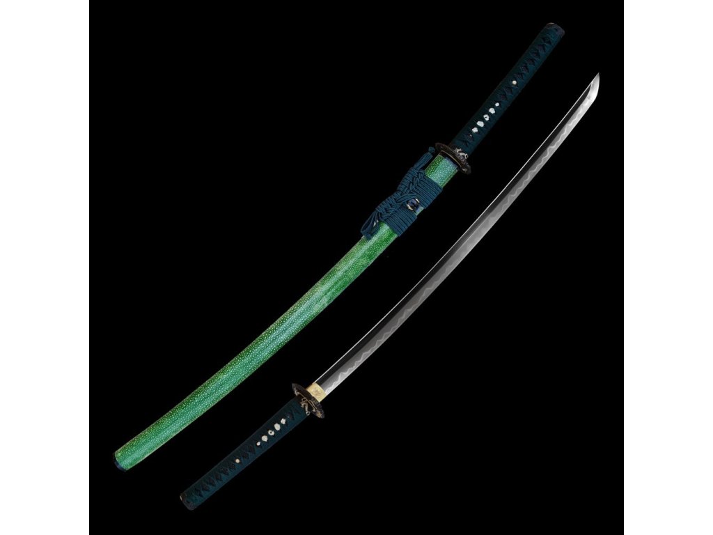 Reálný Choji hamon je tvořen dle dávných tradičních metod, které vychází z mnohaletých zkušeností kovářských mistrů. Tento proces vytváří na čepeli překrásný hamon Hada a Martensite (zrna). Jedná se o špičkovou repliku samurajského meče, která je vhodná k sekovým zkouškám a lze ji rozložit. Tato čepel byla vyzkoušena a testována tak, aby odstranila vše co jí stojí v cestě ! Sori (zakřivení čepele) umožňuje provádění sekání tak, aby bylo dosaženo co možná nejjemnějších a nejčistších řezů. To vše v kombinaci s výběrem tradičního Koshirae zaručuje, že získáte to nejlepší z hlediska vzhledu i funkčnosti. Monokompositnítní uhlíková ocel AISI 1075 má působivou tvrdost ve škále HRC- perfektní kombinace této tvrdosti je podtrženo zakřivením čepele Sori, které umožňuje snadné přeseknutí tatami, slaměné rohože, nebo bambusu pro tameshigiri. Full tang konstrukce této katany výrazně zvyšuje sílu meče. Hrot čepele je tvarovaný shinogi-zukuri a shubo zukuri kissaki (špičatý hrot), který je velmi dobře definován tím, že hamon prochází po celé délce přes Boshi.
