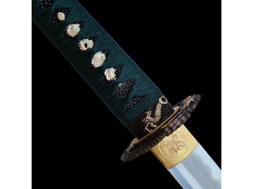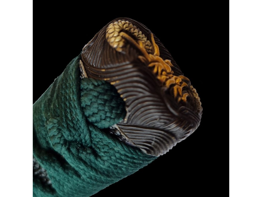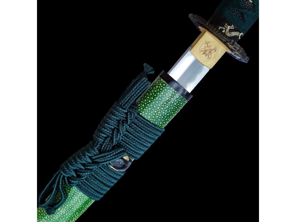 • Tsuka (rukojeť) - dřevěné jádro obalené pravou kůží z rejnoka (Samegawa) zeleným opletem - Ito. Čepel katany je zajištěna dvěma mekugi (kolíky). Čepel od rukojeti můžete odmontovat vytažením těchto kolíků. Na každé straně Tsuky je menuki (ornament).