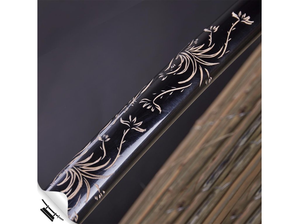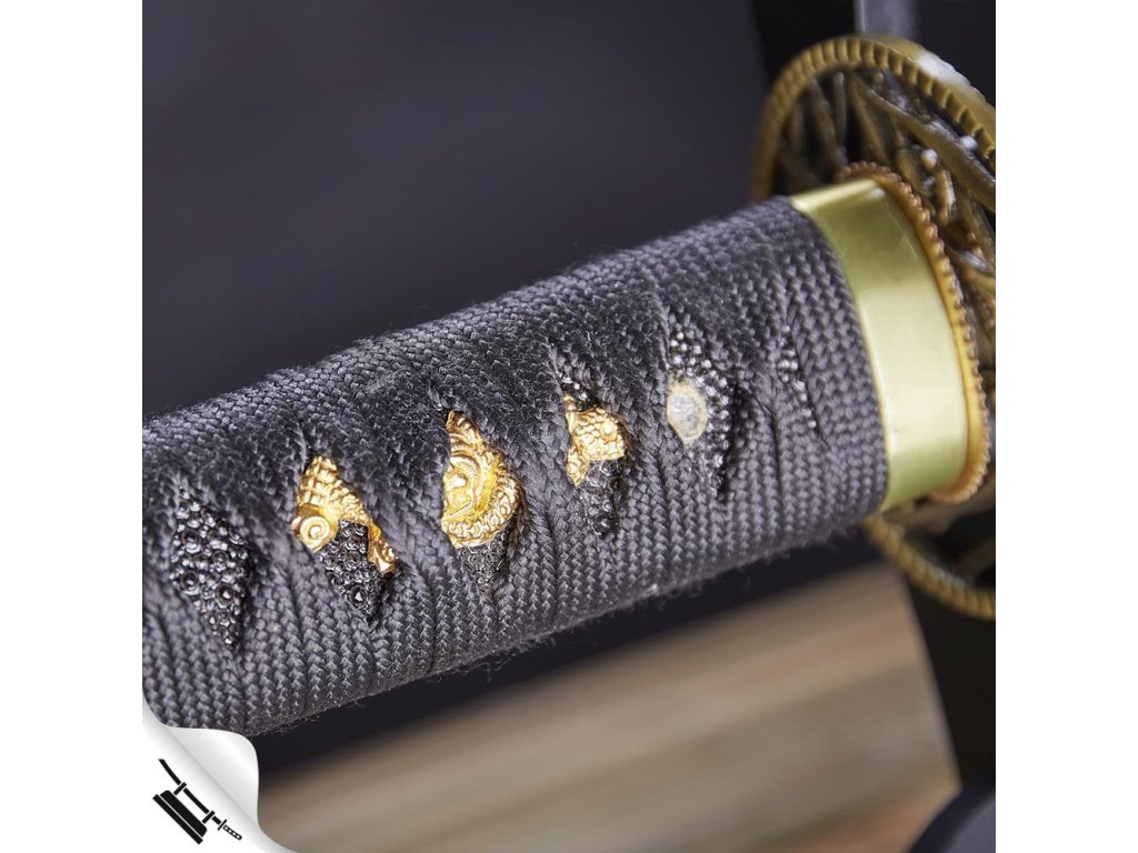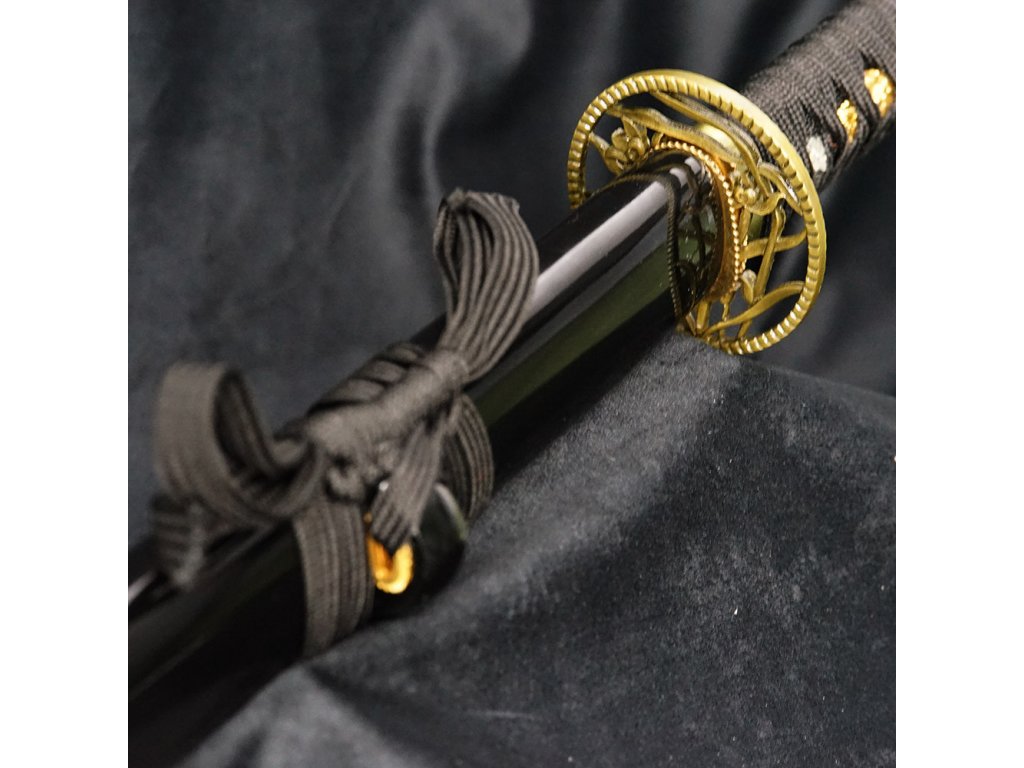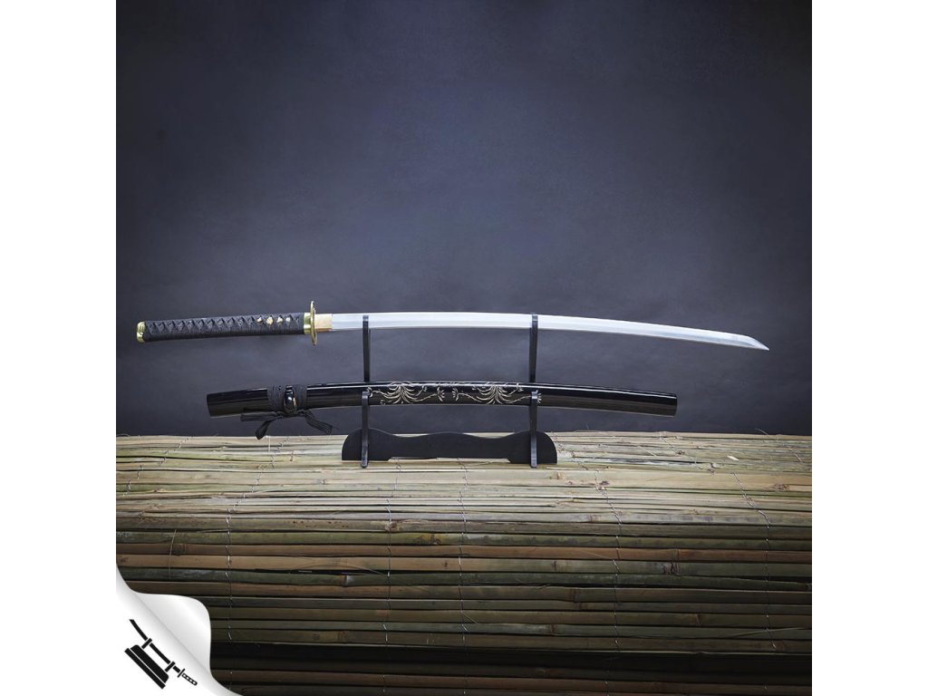 Dekorativní replika meče katana Akunohana s čepelí z uhlíkové oceli AISI 1045 s tvrdostí 48 HRC. Hrot chu-kissaki, Diamond Shaped Yokote. Délka 2,30 shaku, rukojeť s rejnočí kůží, lesklá černá saya s vyrytým motivem louky.