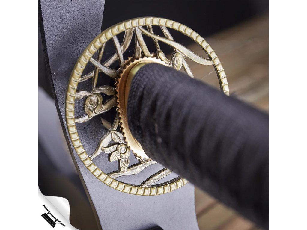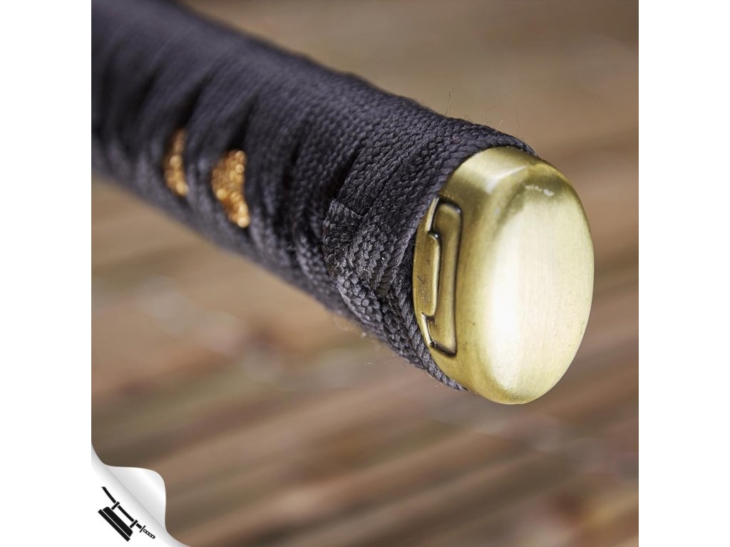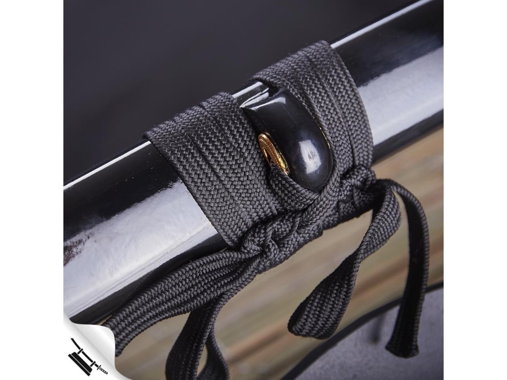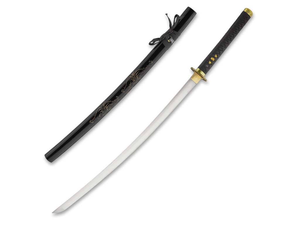 Dekorativní replika meče katana Akunohana s čepelí z uhlíkové oceli AISI 1045 s tvrdostí 48 HRC. Hrot chu-kissaki, Diamond Shaped Yokote. Délka 2,30 shaku, rukojeť s rejnočí kůží, lesklá černá saya s vyrytým motivem louky.