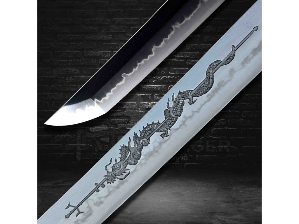 Replika samurajského meče Dragon Spear Horimono s čepelí z uhlíkové oceli T-10 je kovářským mistrovským dílem. Diferenciálně tvrzená čepel v konfiguraci Maru nabízí excelentní tvrdost HRC 58 a výjimečnou ostrost díky ručnímu leštění hazuya kamenem. Na čepeli bez žlábku vyniká rytina draka a nádherný reálný hamon typu Choji ve vzoru Clover Tree Flower, vzniklý tradičními technikami. Zakřivení Sori zaručuje plynulé a čisté řezy při tameshigiri. Hrot ve stylu shinogi-zukuri s dobře definovaným Diamond-Shaped Yokote dotváří perfektní vzhled i funkčnost této full tang katany. Délka čepele je 2,5 Shaku (76 cm).