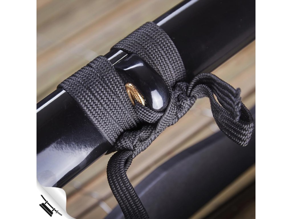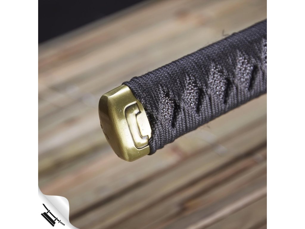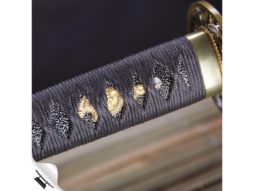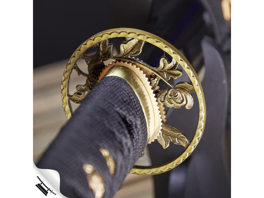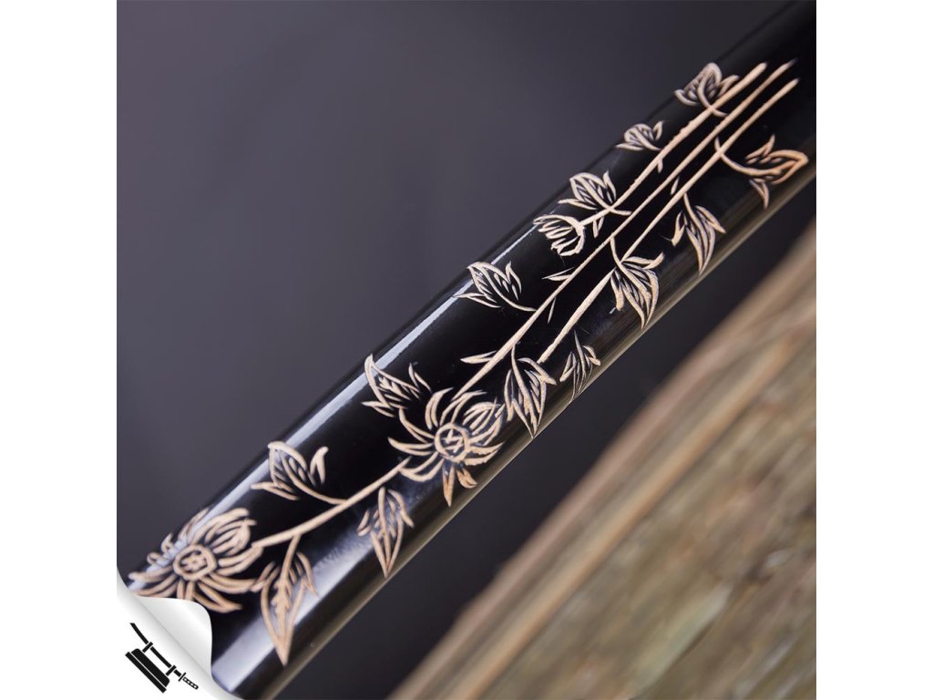 Dekorativní replika meče katana Himawari s čepelí z uhlíkové oceli AISI 1045 s tvrdostí 48 HRC. Hrot chu-kissaki, Diamond Shaped Yokote. Délka 2,30 shaku, rukojeť s rejnočí kůží, lesklá černá saya s vyrytým motivem slunečnice.