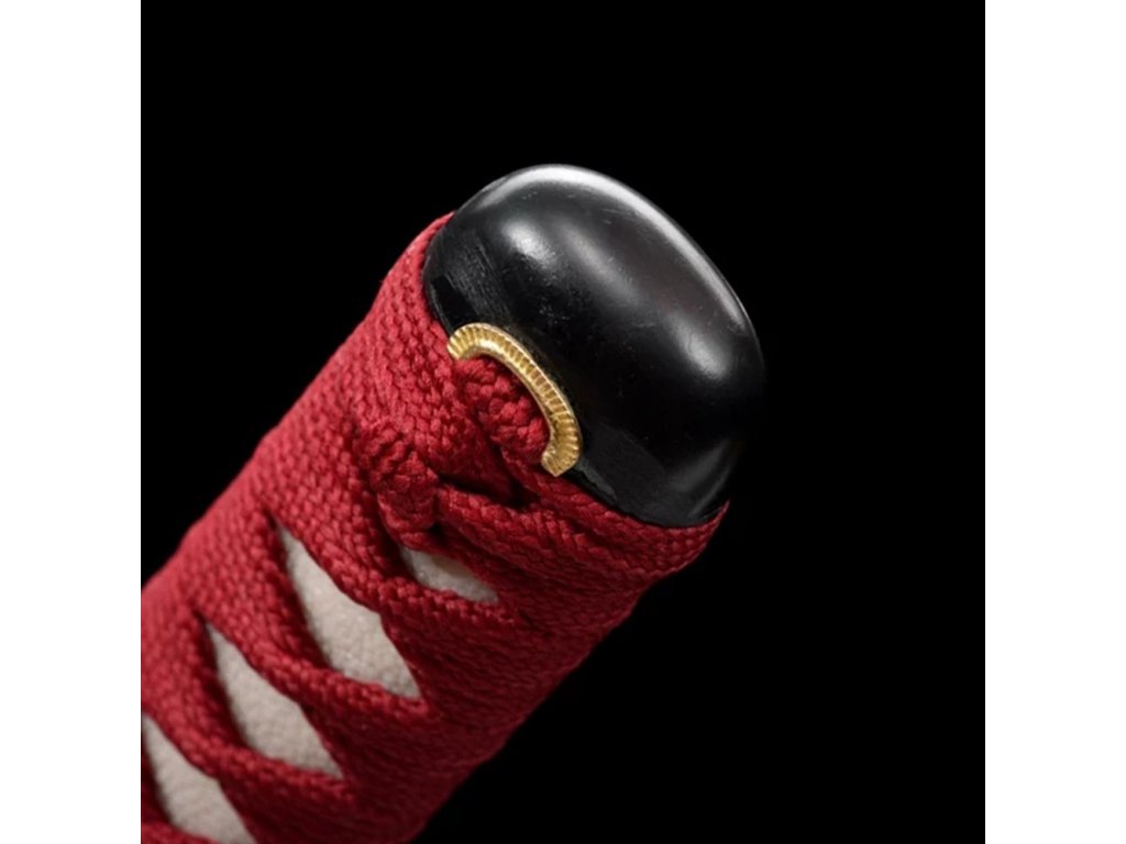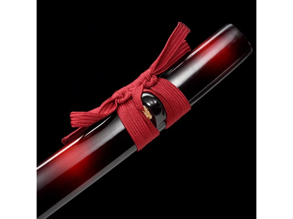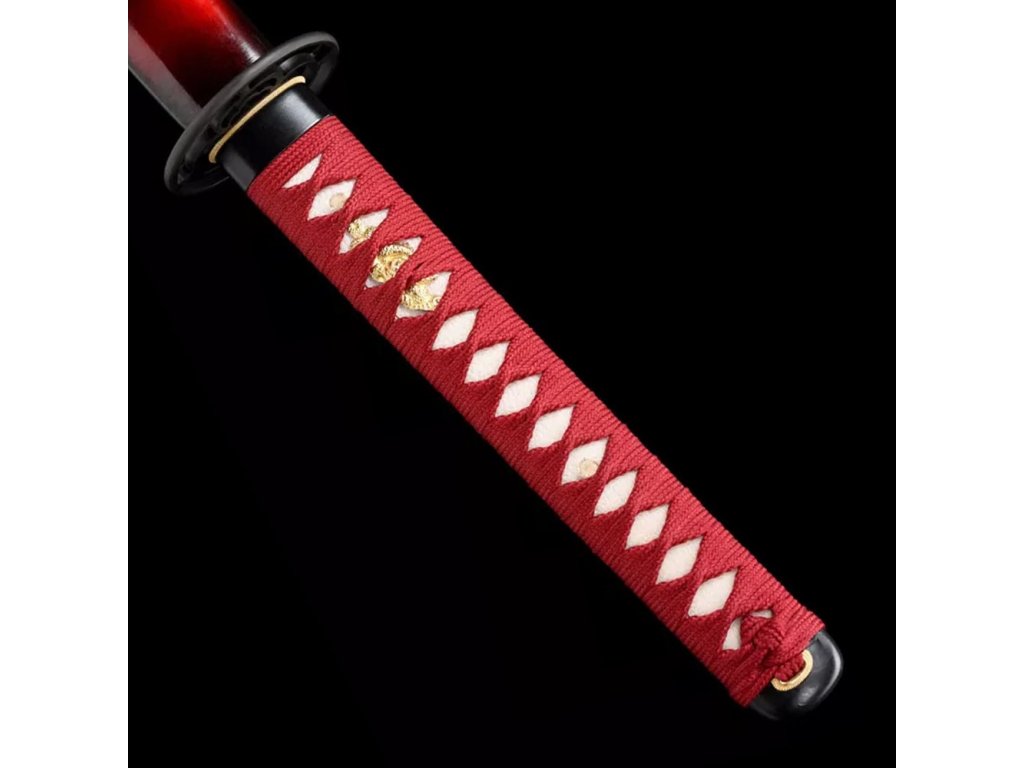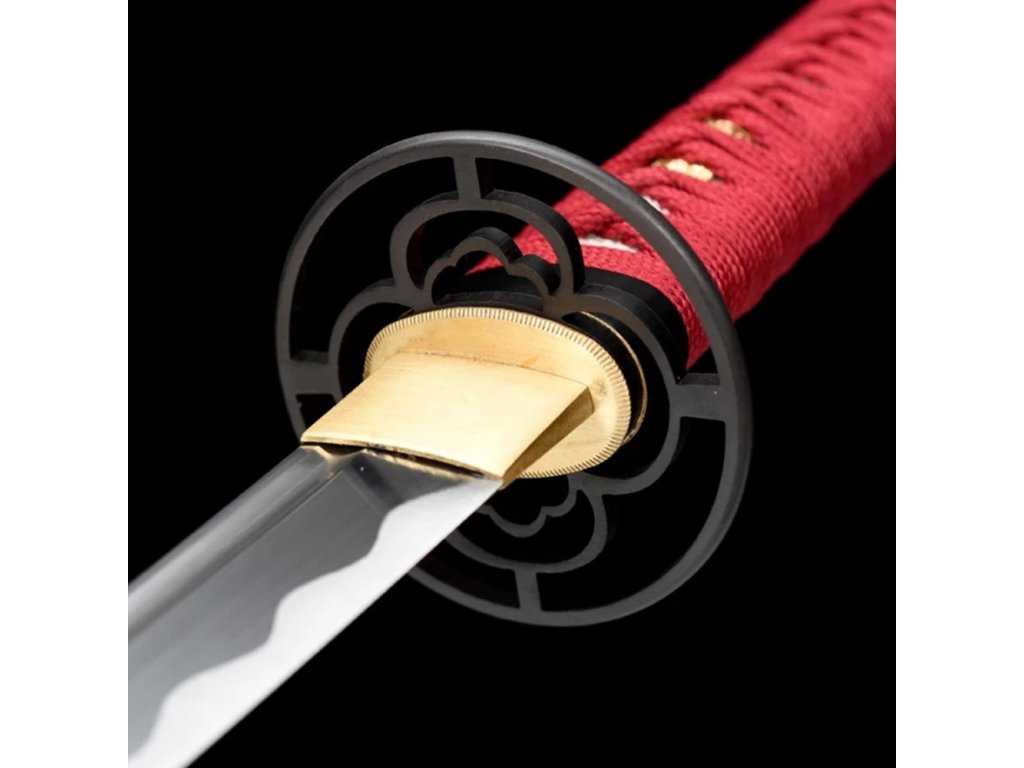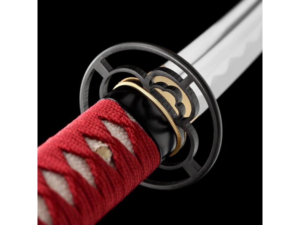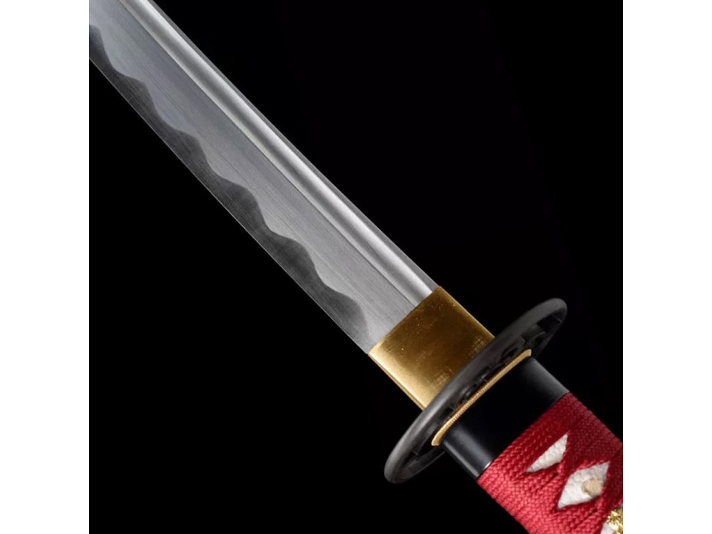 Dekorativní replika meče katana Jū-dachi s čepelí z uhlíkové oceli AISI 1045 se žlábkem Bo-Hi a leštěnou imitací hamonu. Tvrdost ostří (hasaki) 48 HRC. Hrot chu-kissaki, Diamond Shaped Yokote. Délka 2,30 shaku, rukojeť s rejnočí kůží, černá lesklá saya s vínovým zdobením.
