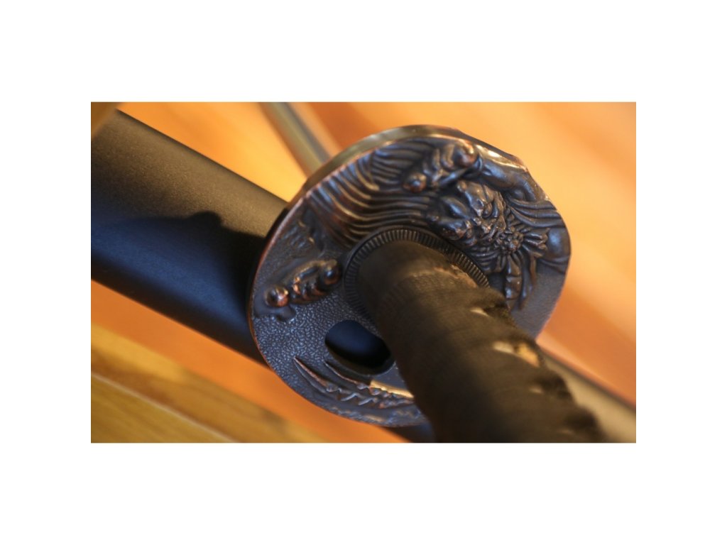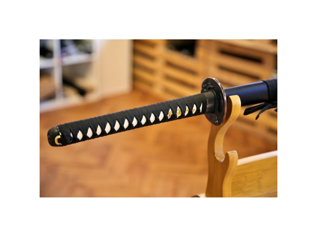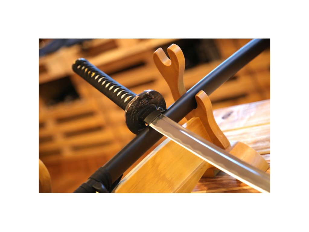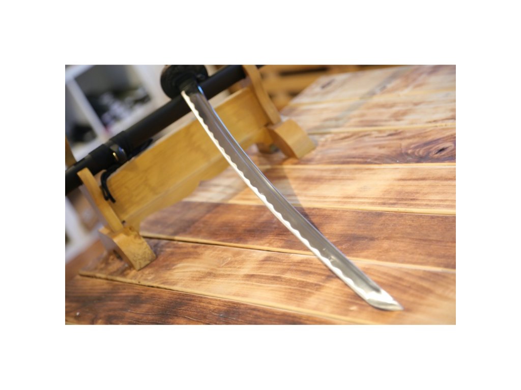 Kovaný meč s čepelí z uhlíkové oceli AISI 1045 s leštěnou imitací kalení (hamonu) a žlábkem Bo-Hi. Ostrý (broušený) samurajský meč najde své uplatnění jako dekorace, ale i k aktivnímu nácviku bojového umění. Katana není zcela vhodná k sekání tvrdších materiálů. Ocel není parciálně zakalena (hamon je pouze leštěný) a proto má nízký stupeň tvrdosti. Sekání tvrdých materiálů by zanechalo stopy na ostří meče. Atraktivní a ostrá čepel, černá matná saya, tsuka (rukojeť), která je potažena pravou rejnočí kůží, to vše dělá tuto katanu velmi zajímavou a žádanou. Katana je uložena v plátěném vaku a papírové krabici. Ostří katany zdobí leštěná imitace kalicí linky hamonu. Firma Dellinger se zříká jakékoliv odpovědnosti za zranění a poškození vzniklá při použití. Schraňujte wakizashi mimo dosah dětí! Jakákoliv manipulace se samurajským mečem je na vaší vlastní odpovědnost. Nezapomeňte, že máte ve svých rukou smrtelnou zbraň!