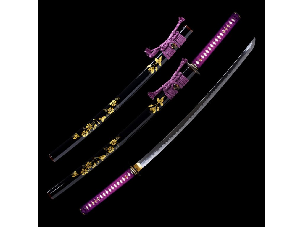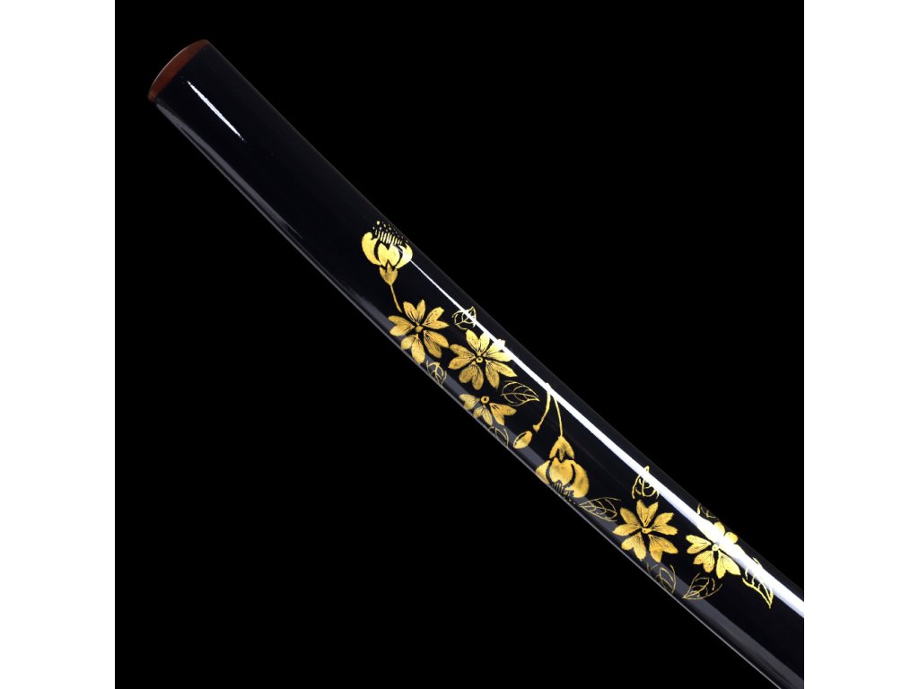 Kovaný japonský meč KATANA s reálným hamonem Choji. Ostrý (broušený) samurajský meč KATANA najde své uplatnění jako dekorace, ale i k aktivnímu nácviku bojového umění. Ocel je parciálně zakalena, má stupeň tvrdosti 58 HRC. Atraktivní a ostrá čepel, saya z tvrdého dřeva lakovaná lesklá, černá s motivem květin plus tsuka (rukojeť), která je potažena pravou rejnočí kůží, to vše dělá tuto katanu velmi zajímavou a žádanou. Katana je uložena v plátěném vaku. Ostří katany zdobí reálný hamon Choji.Firma Dellinger se zříká jakékoliv odpovědnosti za zranění a poškození vzniklá při použití. Schraňujte katanu mimo dosah dětí ! Jakákoliv manipulace se samurajským mečem je na vaší vlastní odpovědnost. Nezapomeňte, že máte ve svých rukou smrtelnou zbraň !