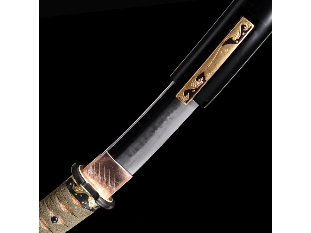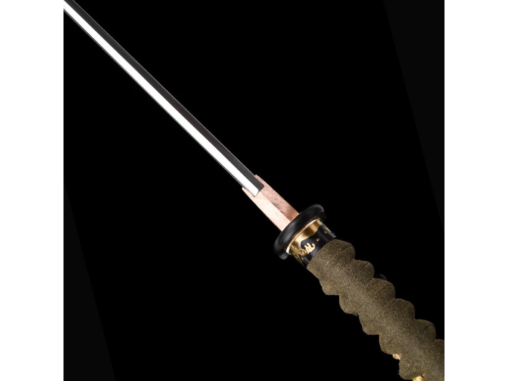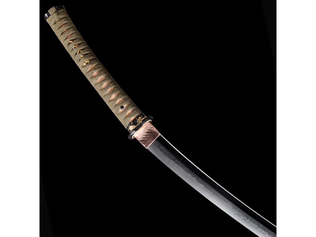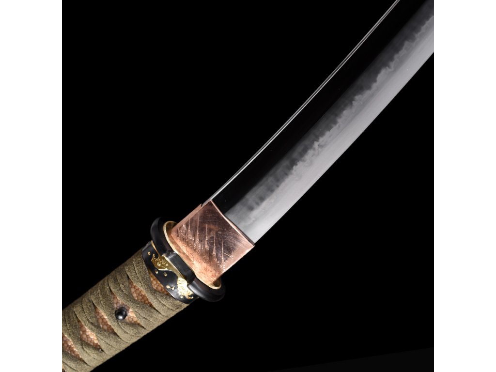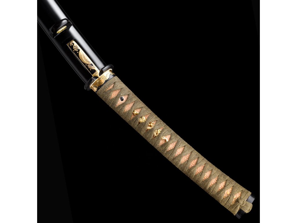 Mistrovsky zpracovaná replika samurajského meče katana Midori Tsunami s čepelí z uhlíkové oceli T10, tvrdost ostří (hasaki) 58 HRC, hrot o kissaki, Diamond Shaped Yokote, skutečný hamon ve stylu choji-midare, výrazné Sori 4,5 cm. Minimalistická mosazná tsuba, rukojeť opletená olivově zelenou koženou šňůrou ve stylu Kawa-Tsumamimaki s menuki ve tvaru zlatých draků a saya s motivy mořských vln podtrhují harmonii tradiční estetiky a funkčnosti. Ideální pro sběratele a milovníky japonské historie a kultury.