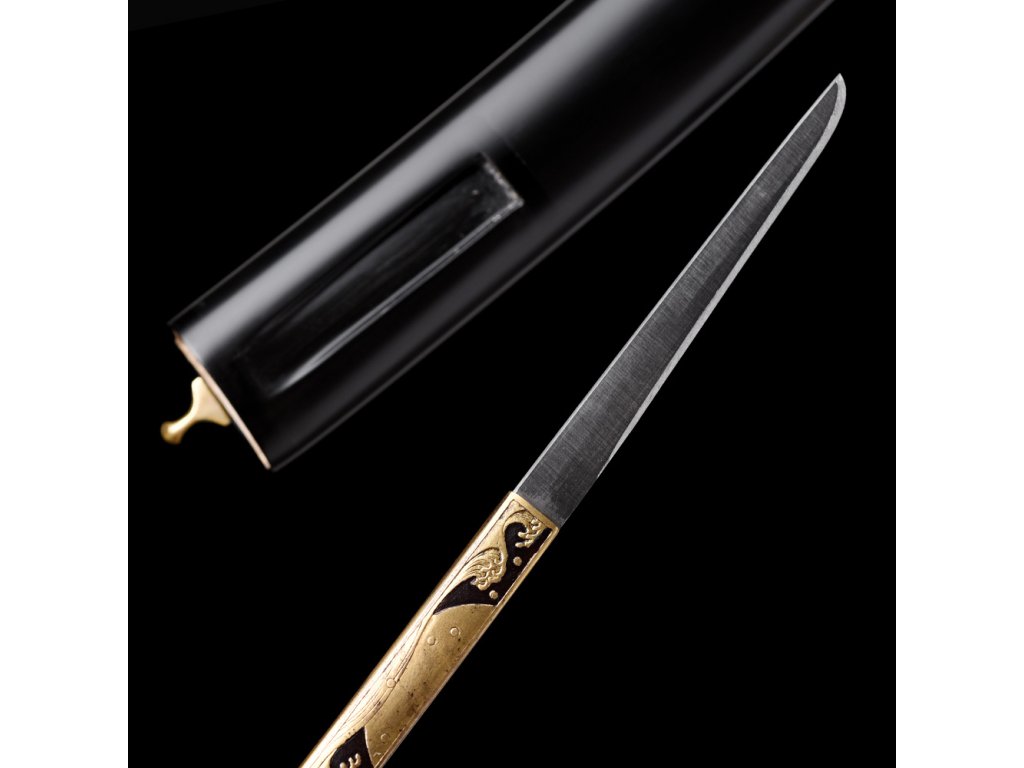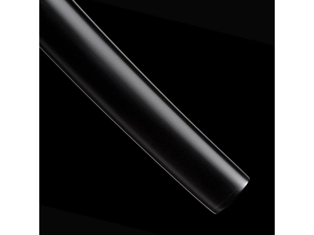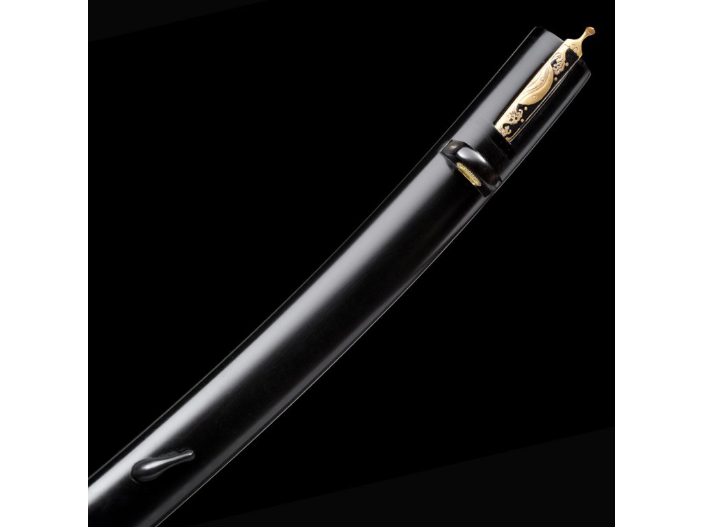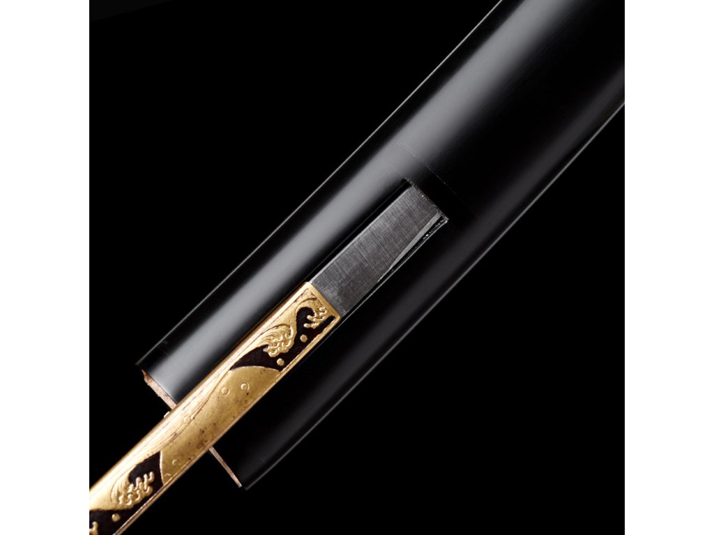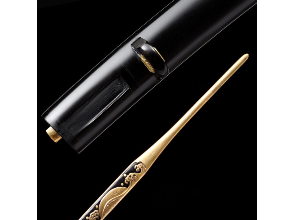 Pochva této katany je vyrobena z pevného dřeva a lakovaná do hluboké černé barvy s lesklým povrchem. Pochva je doplněna ozdobnými kovovými prvky s motivem mořských vln (nami), které symbolizují sílu přírody a nekonečný pohyb života. Katana obsahuje také tradiční kozuka (dekorativní nožík) a kogai (dekorativní špici), oba s motivem mořských vln, což dotváří jednotnou estetiku celé soupravy.