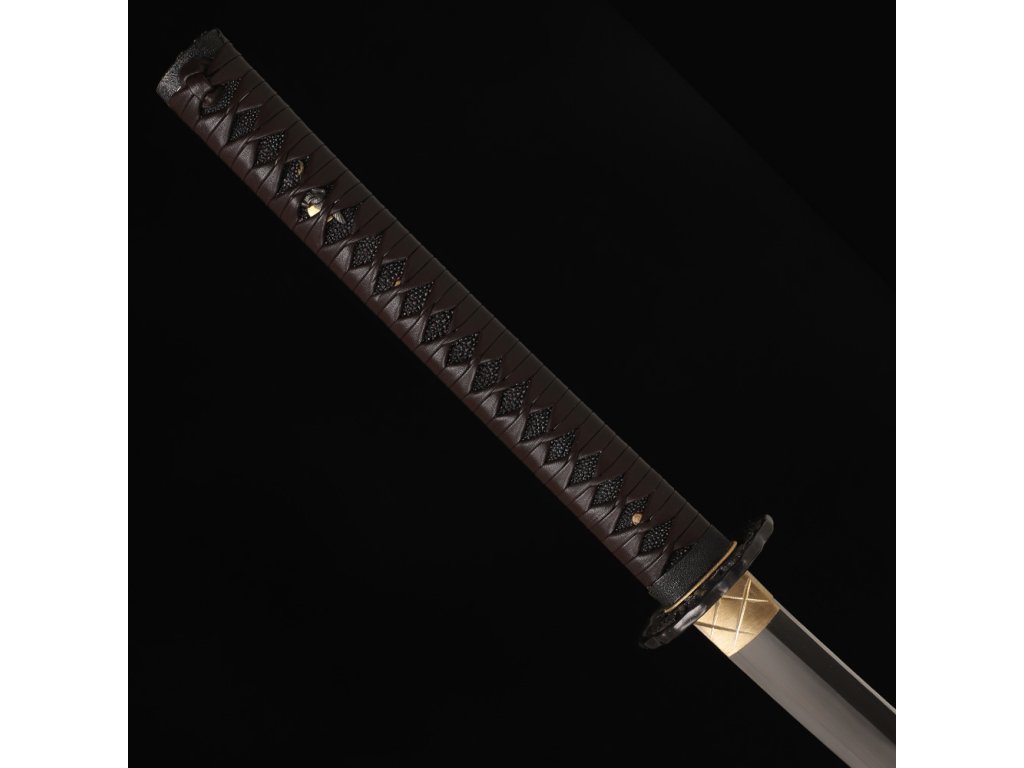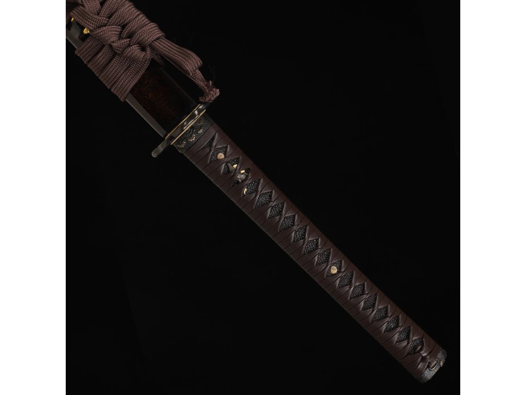 Rukojeť je opletena ve stylu Hineri-maki, což je tradiční styl opletu z kožené šňůry, který zajišťuje stabilitu a dobrý úchop. Tento konkrétní oplet je vyroben z tmavě hnědé kůže, která v kombinaci s rejnočí kůží (samegawa) vytváří luxusní a jedinečný vzhled.
