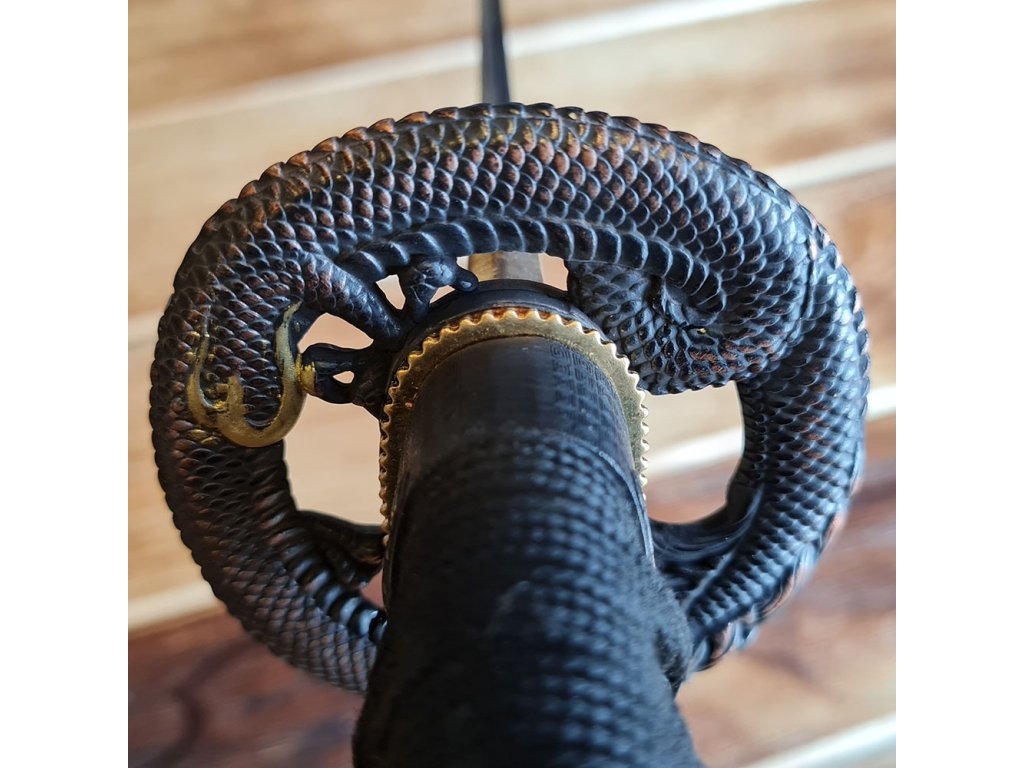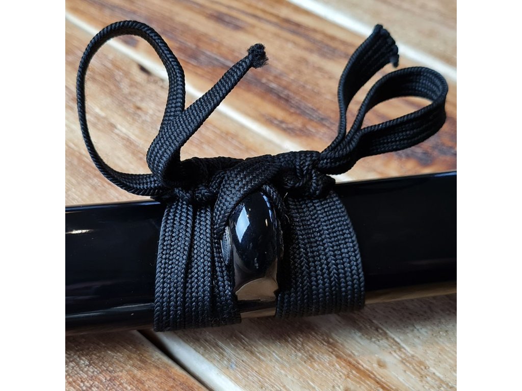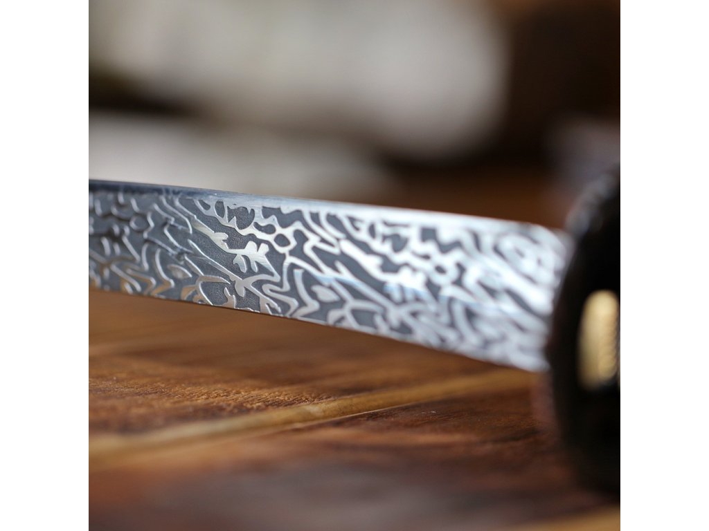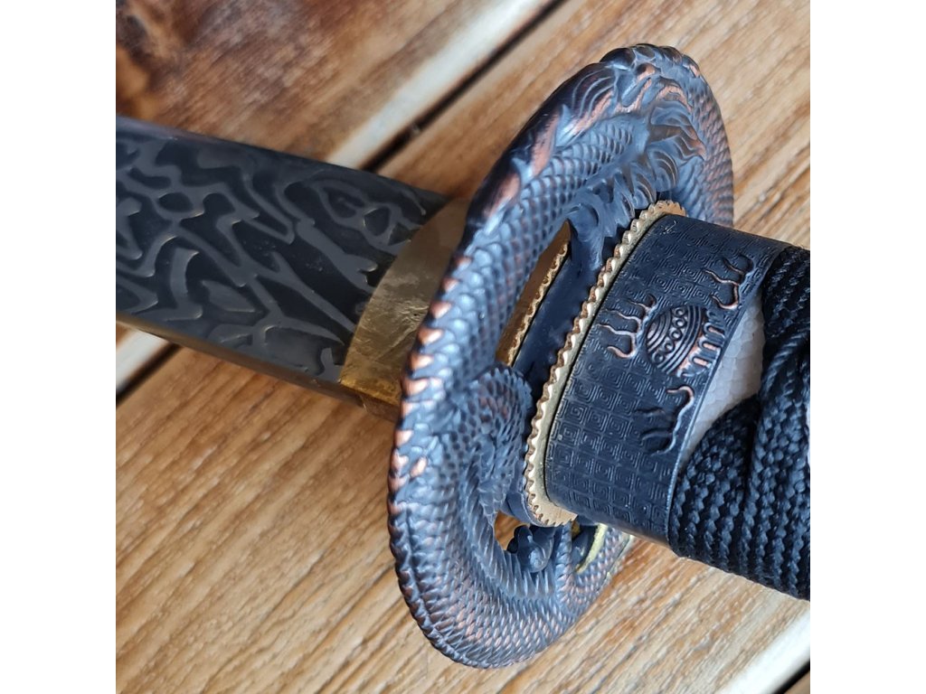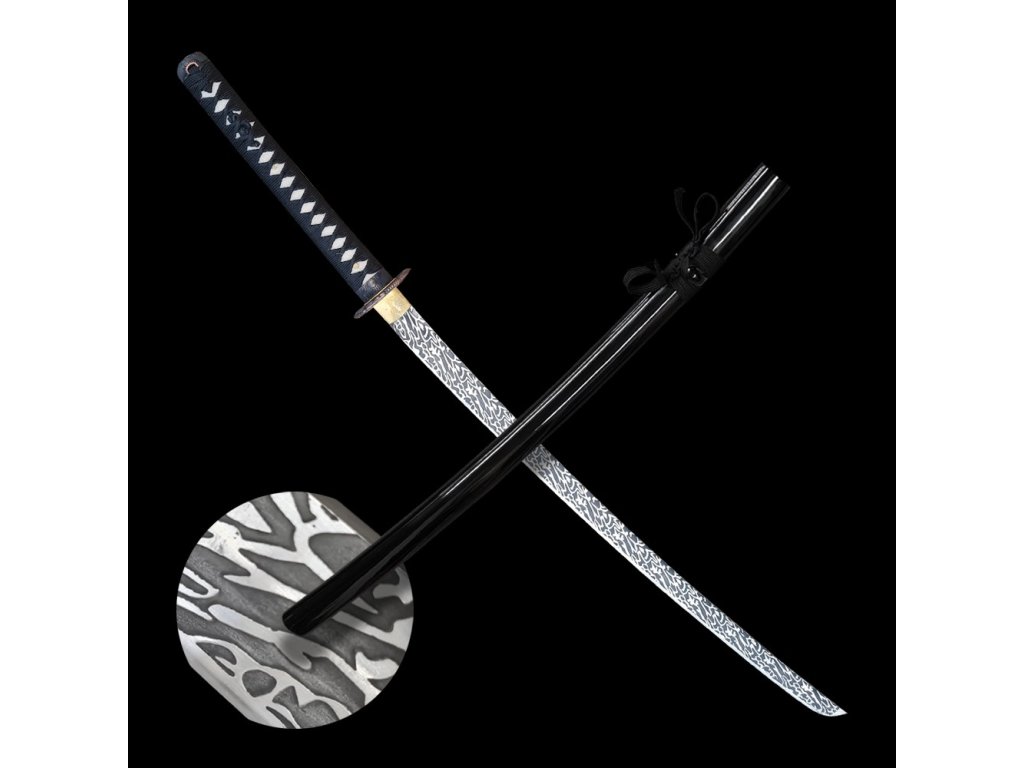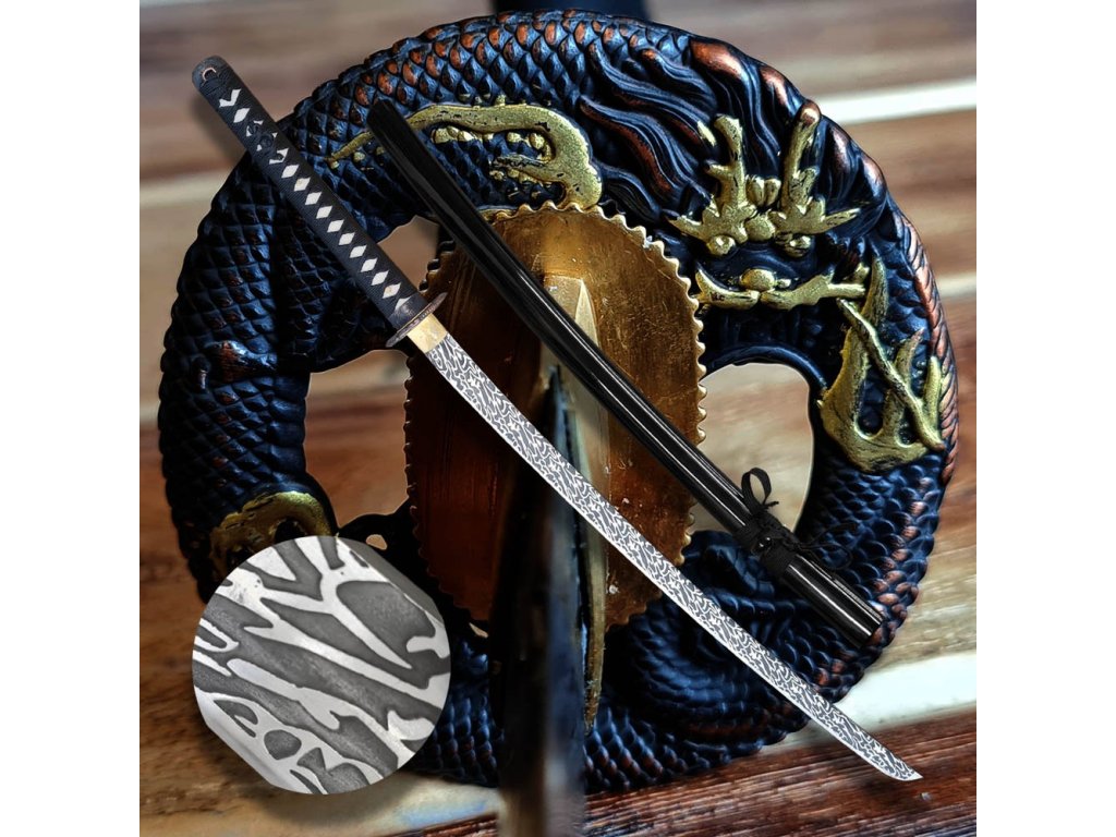 Dekorativní replika meče katana Sunekuai s čepelí z uhlíkové oceli AISI 1045 s 3D vzorem imitace damašku a tvrdostí 48 HRC. Hrot chu-kissaki. Délka 2,26 shaku, rukojeť s rejnočí kůží, lesklá černá saya.