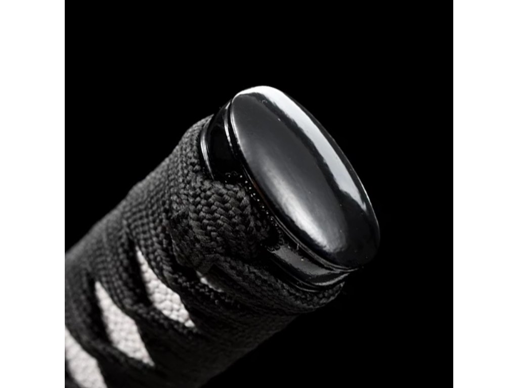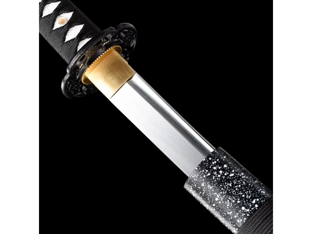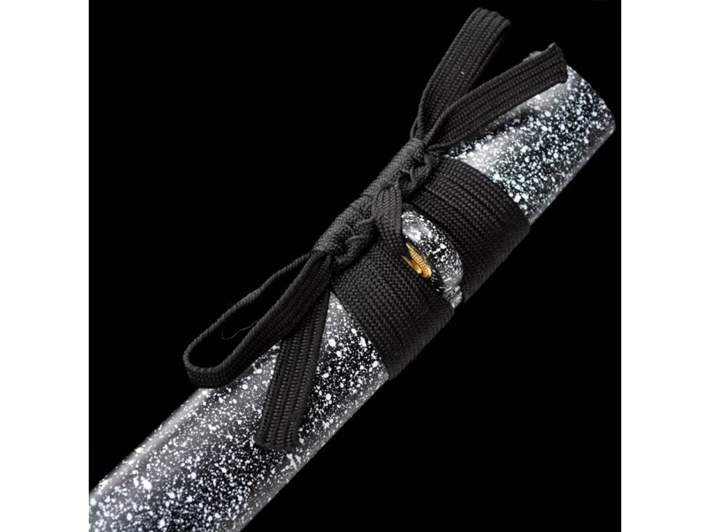 Dekorativní replika meče katana Tanikaze s čepelí z uhlíkové oceli AISI 1065 s tvrdostí ostří 52 HRC, se žlábkem Bo-Hi. Hrot chu-kissaki, Diamond Shaped Yokote. Délka 2,26 Shaku, rukojeť s rejnočí kůží a černá matná saya s bílým postřikem.