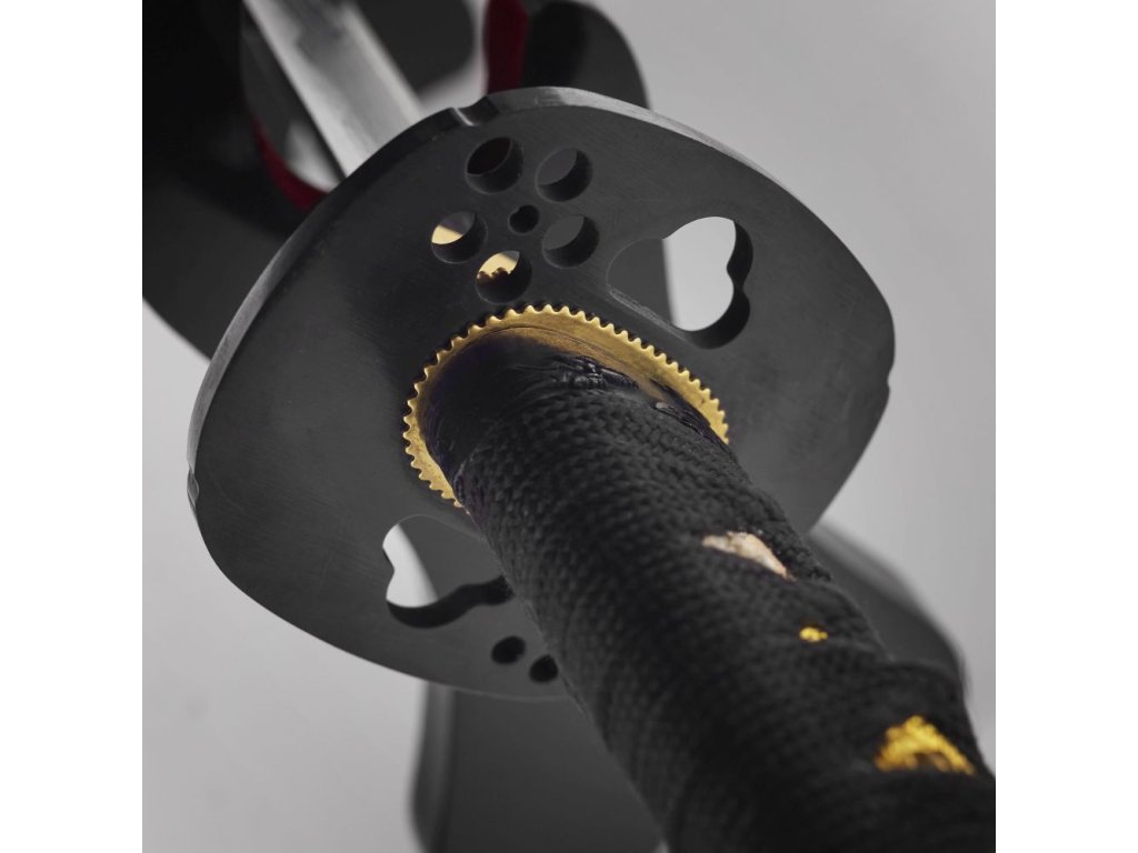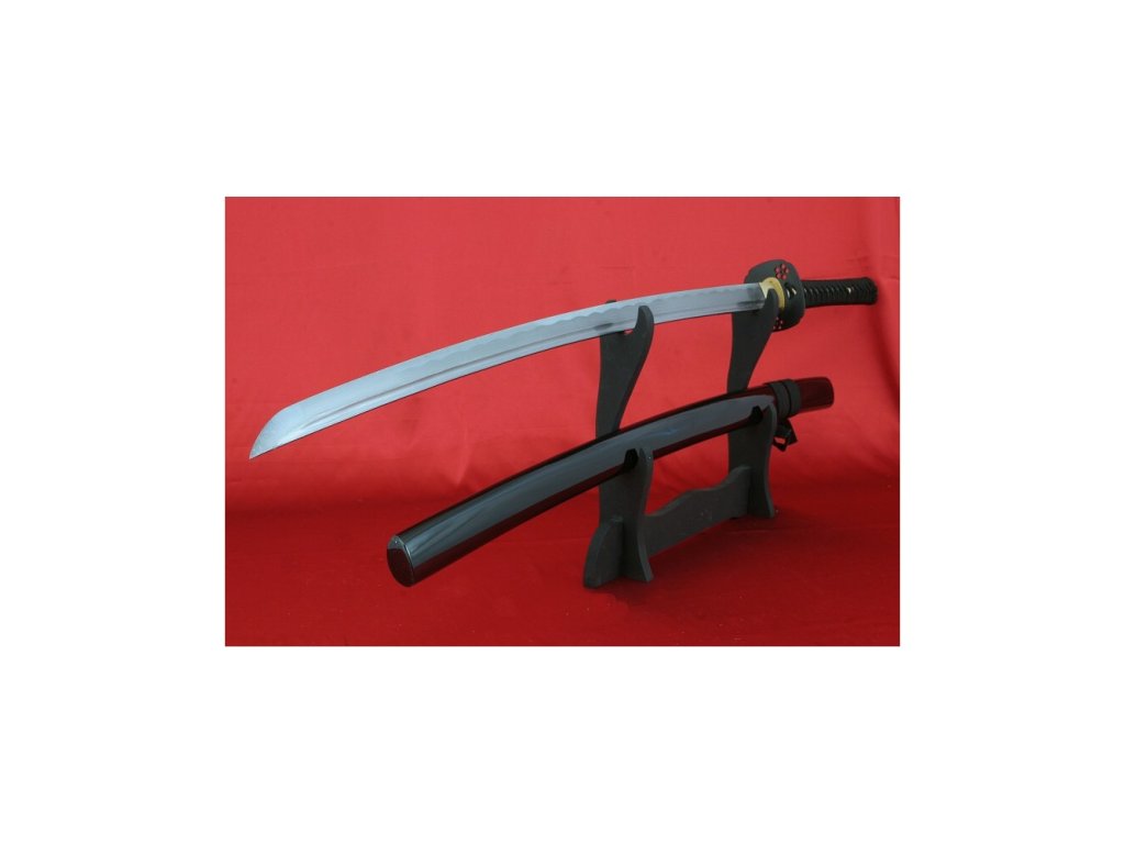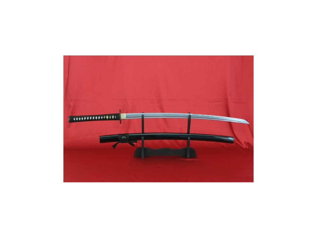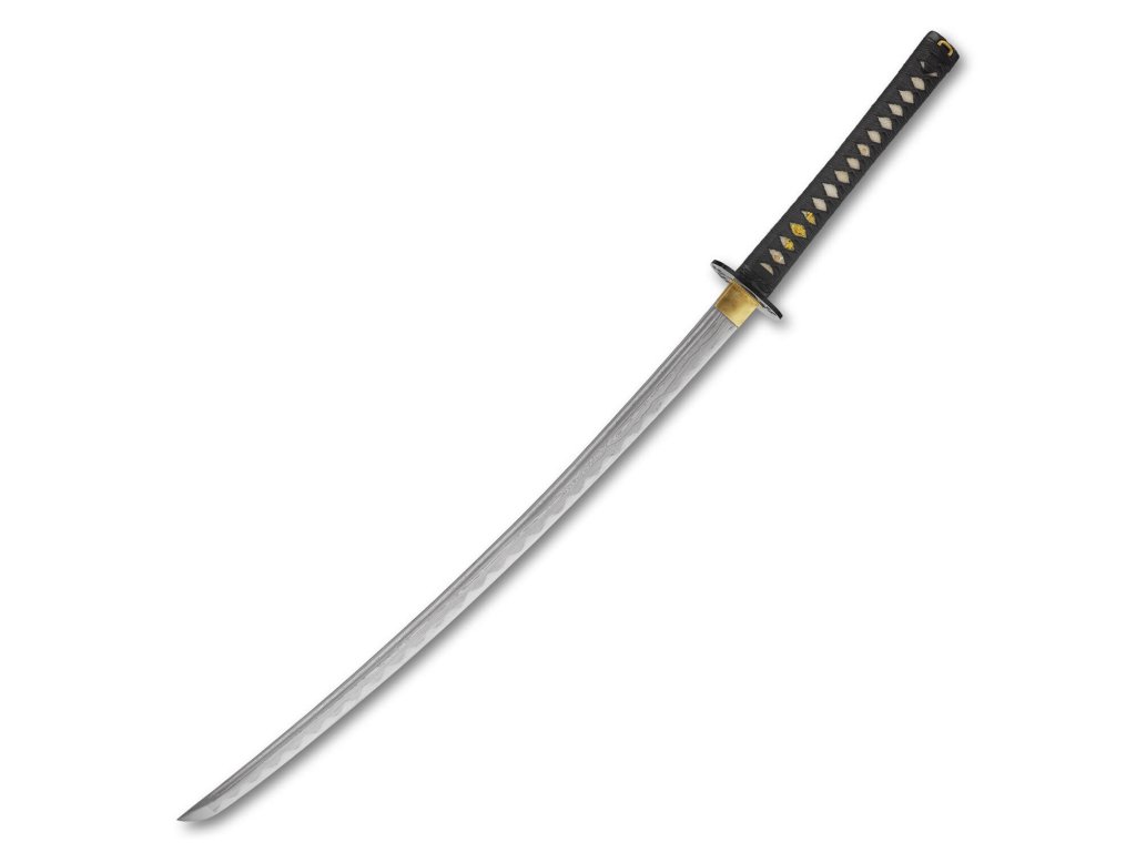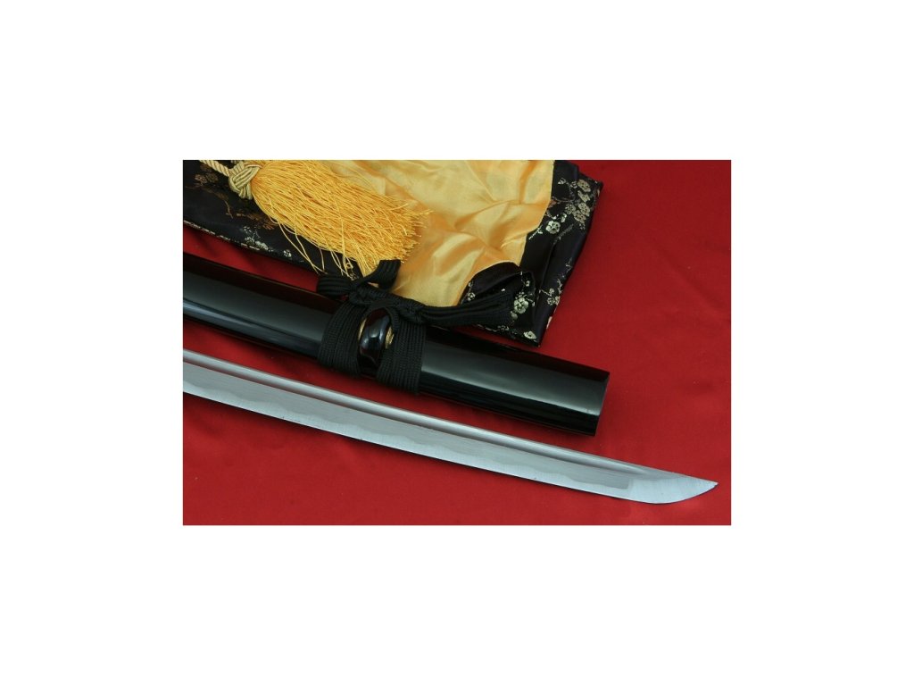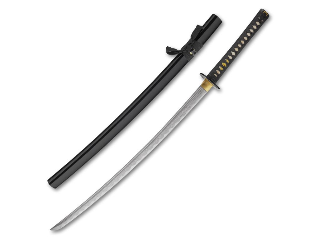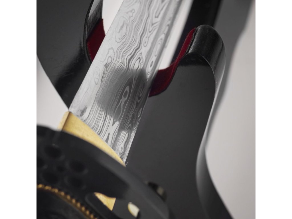 Kovaná replika samurajského meče katana s damaškovou čepelí z oceli AISI 1045 a leštěnou imitací hamonu. Čepel s žlábkem Bo-Hi, hrotem chu-kissaki a yokote. Rukojeť s rejnočí kůží a černá lesklá saya vytváří elegantní celek. Vhodná pro trénink technik i dekoraci, není určena na sekání tvrdých materiálů.