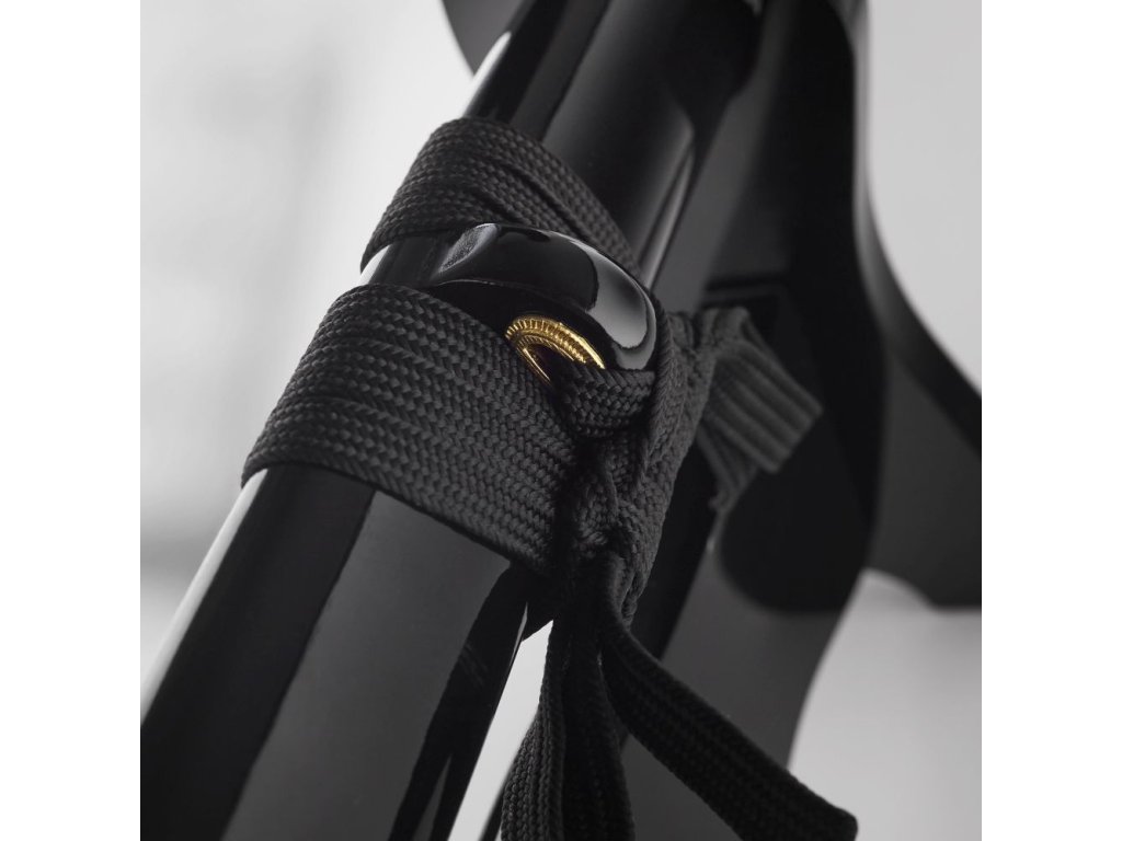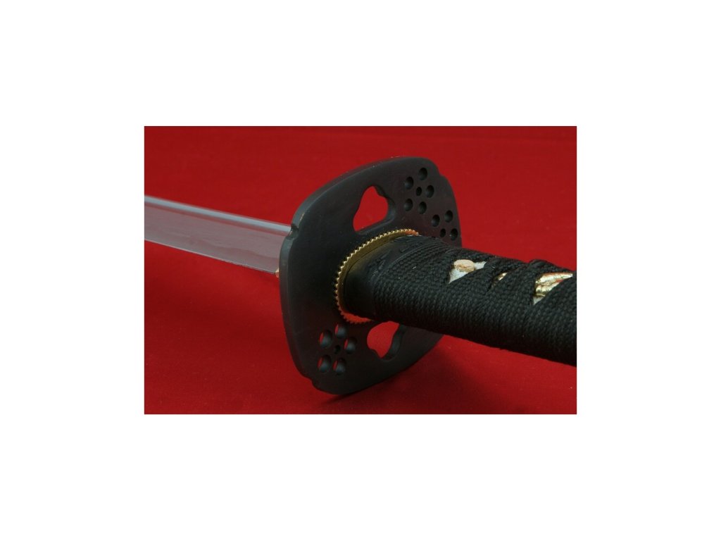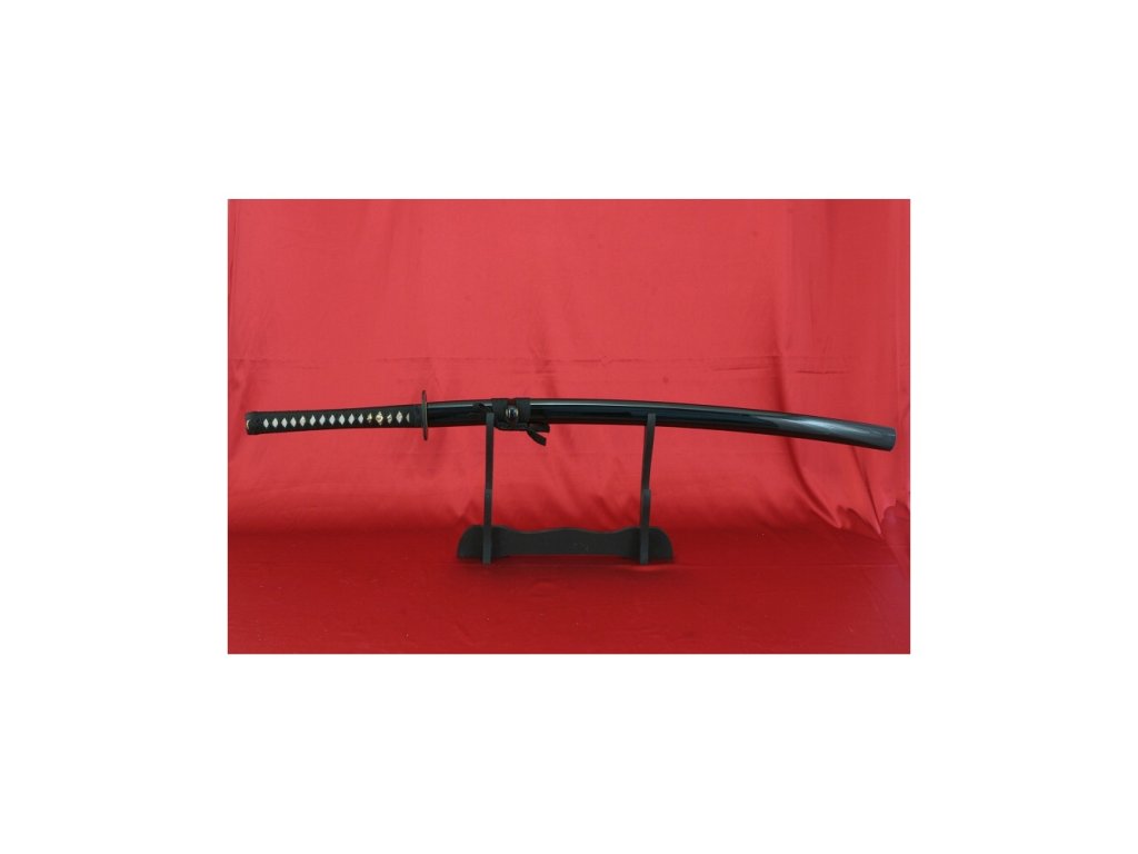 Kovaná replika japonského meče katana s leštěnou imitací kalení (hamonu) a žlábkem Bo-Hi. Ostrý (broušený) samurajský meč katana najde své uplatnění jako dekorace, ale i k aktivnímu nácviku bojového umění. Katana není zcela vhodná k sekání tvrdších materiálů. Ocel není parciálně zakalena (hamon je pouze leštěný) a proto má nízký stupeň tvrdosti. Sekání tvrdých materiálů by zanechalo stopy na ostří meče. Atraktivní a ostrá damašková čepel z oceli AISI 1045, černá lesklá saya plus tsuka (rukojeť), která je potažena pravou rejnočí kůží, to vše dělá tuto katanu velmi zajímavou a žádanou. Katana je uložena v plátěném vaku a papírové krabici. Ostří katany zdobí leštěná imitace kalicí linky hamonu. Firma Dellinger se zříká jakékoliv odpovědnosti za zranění a poškození vzniklá při použití. Schraňujte katanu mimo dosah dětí! Jakákoliv manipulace se samurajským mečem je na vaší vlastní odpovědnost. Nezapomeňte, že máte ve svých rukou smrtelnou zbraň!