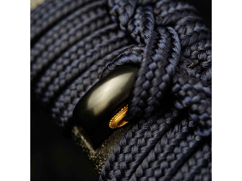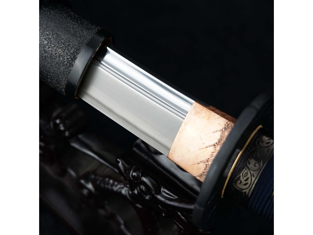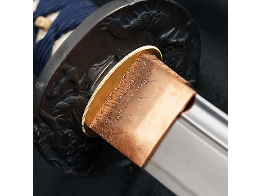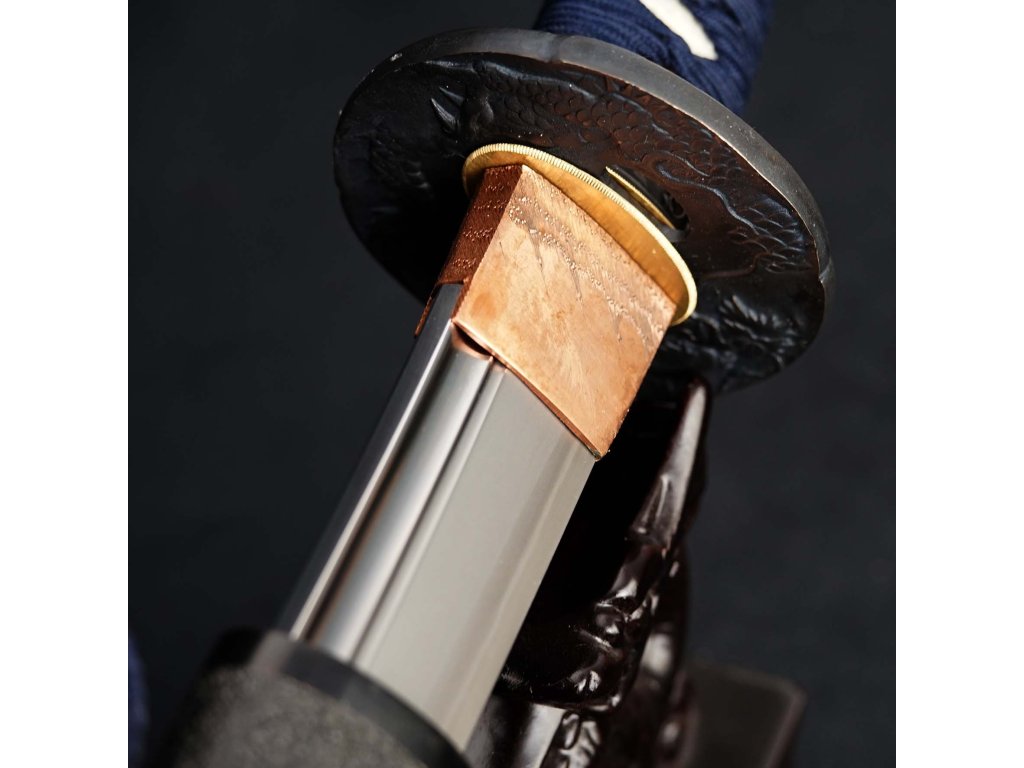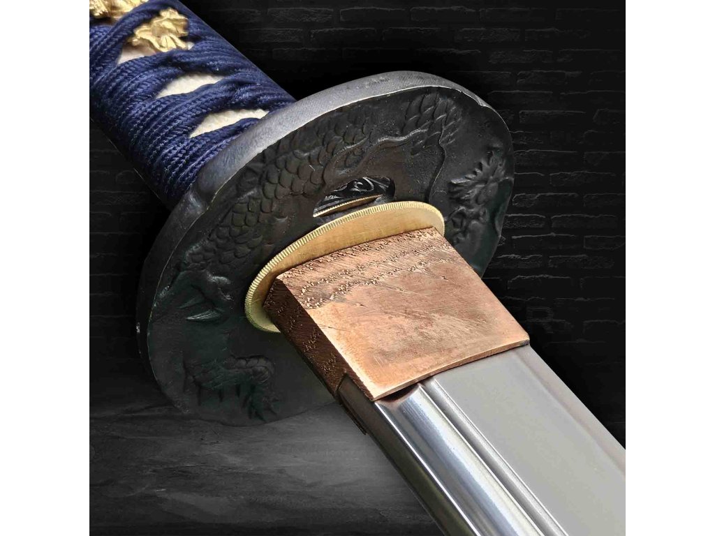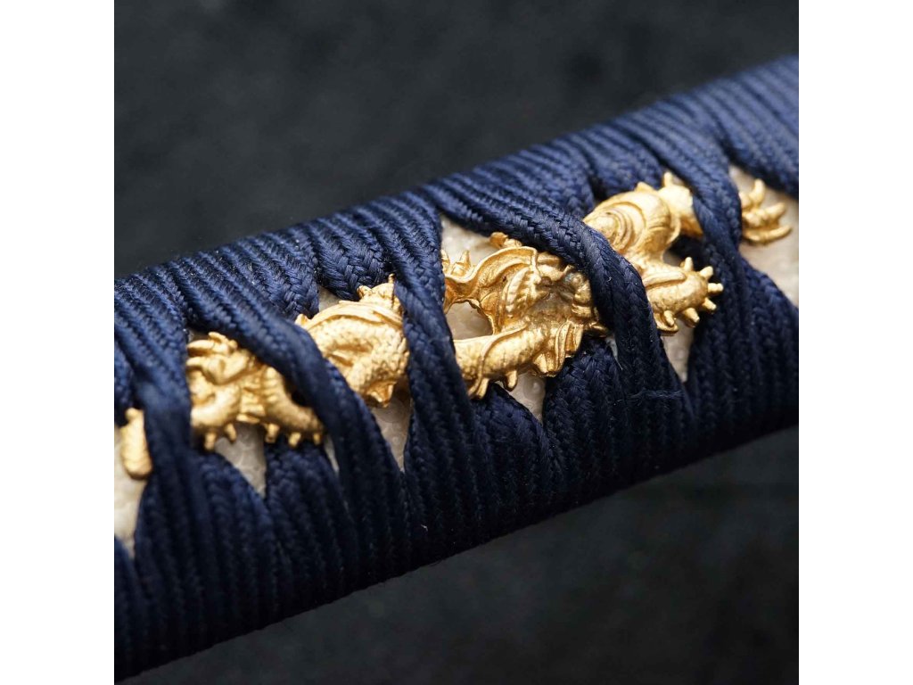 Špičková replika meče katana Yudragon s čepelí z uhlíkové oceli T-10 s reálným hamonem Suguha, tvrdost ostří 58 HRC, délka čepele Nagasa 2,20 Shaku. Hrot chu-kissaki, Diamond Shaped Yokote a žlábek bo-hi po celé délce čepele. Kulatá tsuba s reliéfním motivem draka a mraků a detailními hranami, mosazná seppa. Tsuka z tvrdého dřeva, potažená rejnočí kůží a modrým opletem tsuka-ito. Na obou stranách zlaté figurální menuki s motivem draka. Tmavá černá saya s jemnou texturou (stone finish). Modrý oplet sageo. Kurigata, Koiguchi a Kojiri z materiálu G10. Katana je ideální jako sběratelský kus nebo k aktivnímu nácviku bojového umění.
