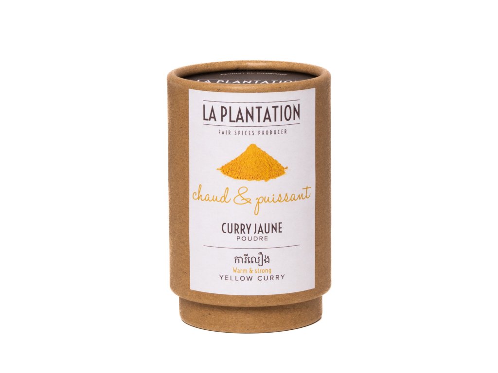 Ve směsi žlutého kari z Kambodži naleznete kurkumu, citronovou trávu, dlouhé sladké chilli, bird chilli, červený Kampotský pepř, palmový cukr, Fleur de Sel, česnek, kafrové a kari lístky, zelené mango.