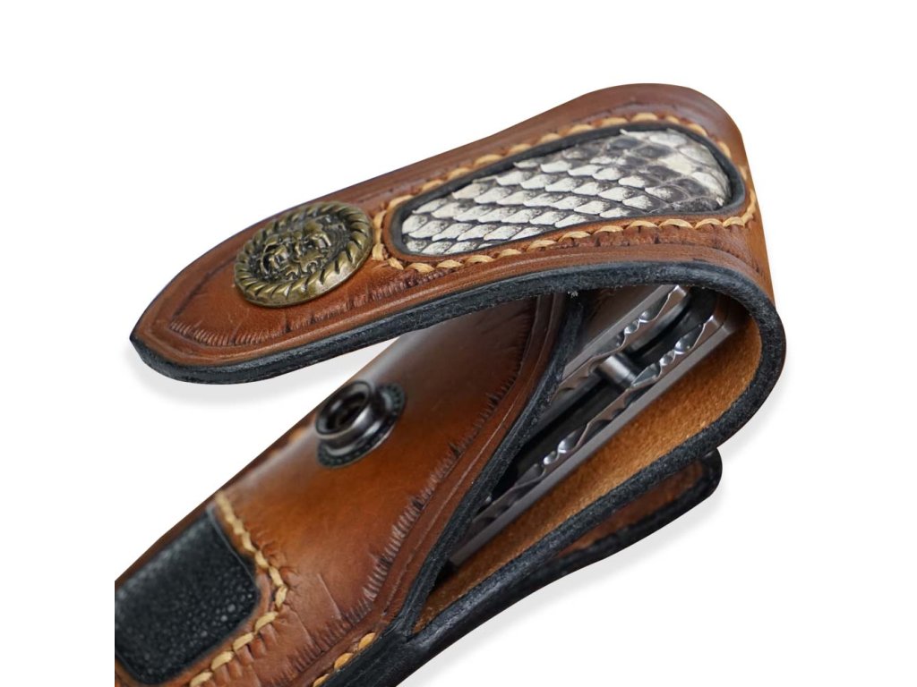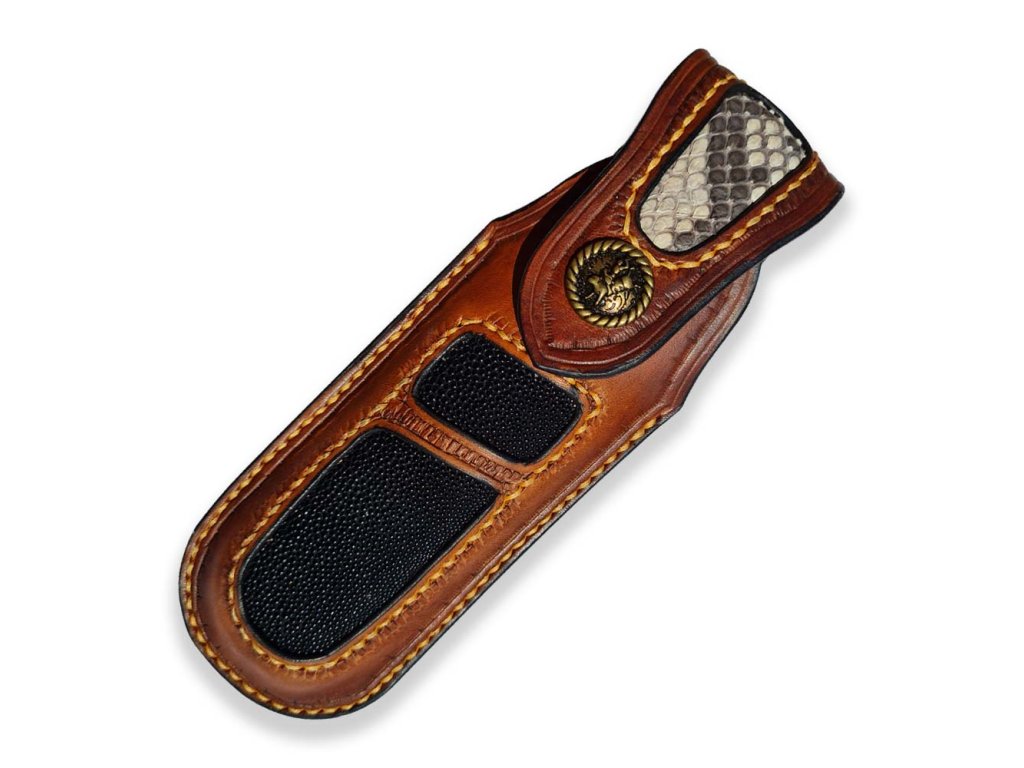 Luxusní kožené pouzdro z hovězí a hadí kůže a kůže perlové ryby. Ručně šité, s poutkem na opasek do šířky 6 cm a pevnou zapínací patentkou pro bezpečné nošení nože. Pouzdro je primárně určeno pro nůž Dellinger Tanto Lenge Obsidian VG-10.
