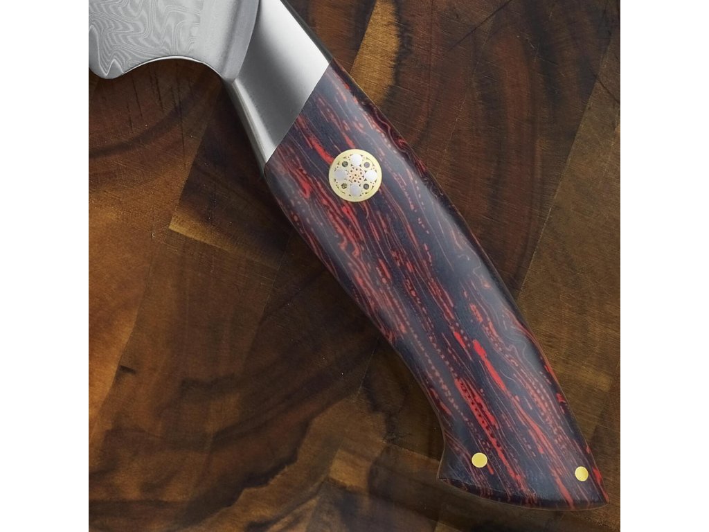 Rukojeť je vyrobena z červené a černé G10 damaškového vzoru. Je zdobená středovým mozaikovým nýtem. Trojité nýtování zajišťuje dokonalou pevnost, stabilitu a spojení ostří a rukojeti. Rukojeť je pečlivě ručně leštěná, ergonomicky tvarovaná a navržená pro vynikající ruční ovládání. Speciálně navržený tvar rukojeti je vhodný pro asijský úchop nože. G10 je voděodolná a zcela bez zápachu, nevyžaduje prakticky žádnou údržbu. Nezačne v průběhu času korodovat, oxidovat, zůstane stejně tvrdá a pevná.