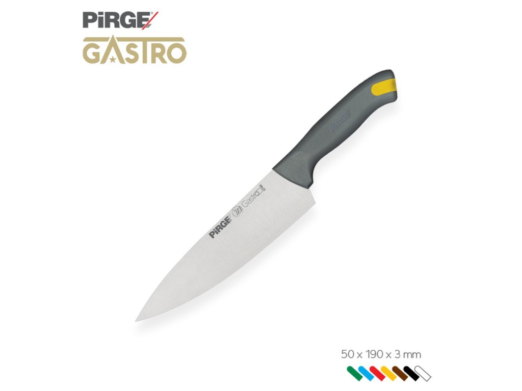 Nůž šéfkuchaře Chef PIRGE GASTRO z německé oceli 1.4116 a rukojetí z polypropylenu (PPC). Všestranný nůž na maso, vhodný pro běžné krájení. 7 barevných pinů dle HACCP. Délka ostří 190 mm.