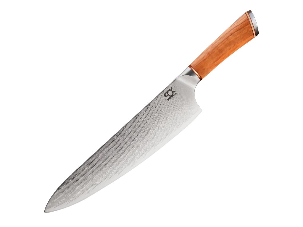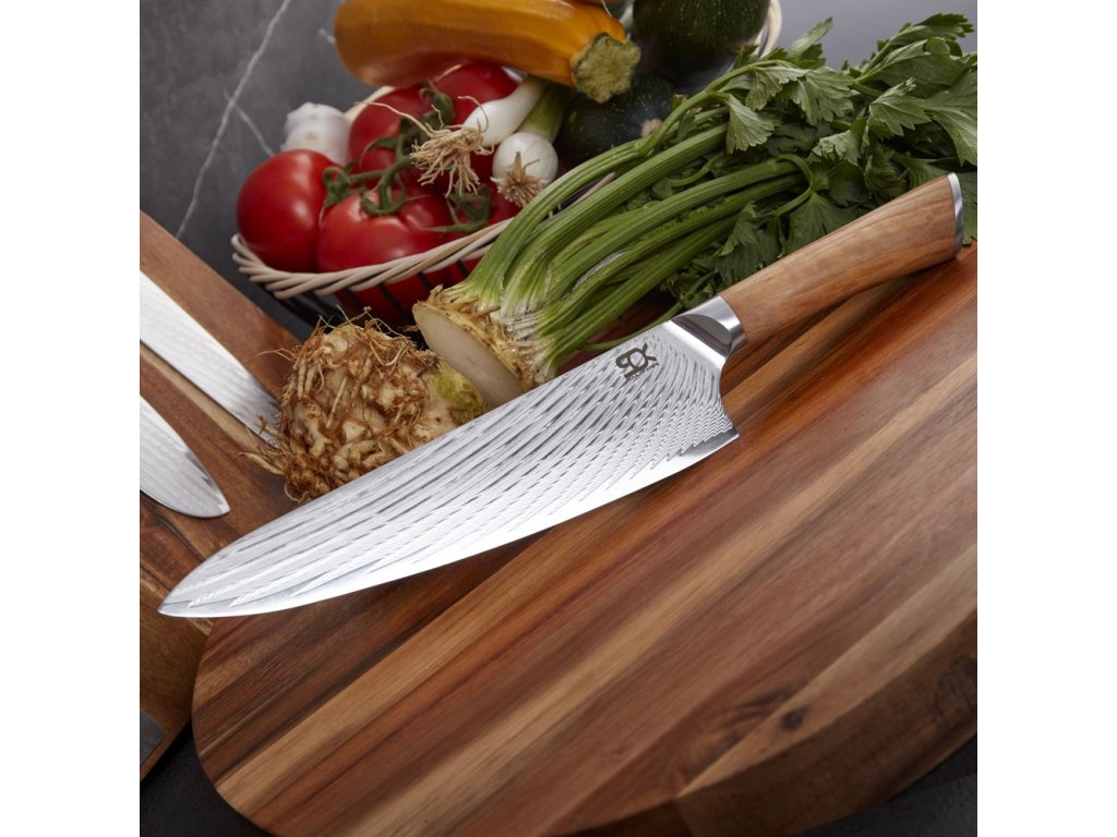 Kuchyňský nůž Chef ze série SOK Olive Sunshine Damascus z damaškové oceli VG10. Nůž je určen pro krájení, plátkování, čištění a kolébkové krájení masa, ovoce, zeleniny a bylinek. Rukojeť je vyrobena z olivového dřeva. Délka ostří 205 mm.