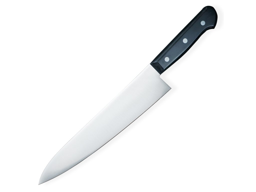 Japonský kuchařský nůž Chef/Gyuto s čepelí z nerezové molybdenové oceli a klasickou západní rukojetí z pryskyřice se třemi nýty. Délka čepele 240 mm.