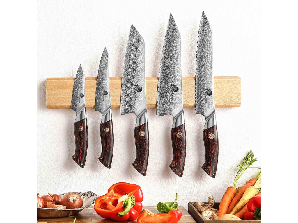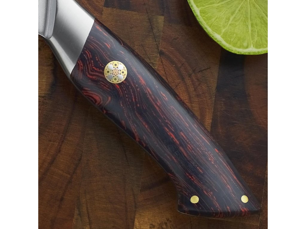 Rukojeť je vyrobena z červené a černé G10 damaškového vzoru. Je zdobená středovým mozaikovým nýtem. Trojité nýtování zajišťuje dokonalou pevnost, stabilitu a spojení ostří a rukojeti. Rukojeť je pečlivě ručně leštěná, ergonomicky tvarovaná a navržená pro vynikající ruční ovládání. Speciálně navržený tvar rukojeti je vhodný pro asijský úchop nože. G10 je voděodolná a zcela bez zápachu, nevyžaduje prakticky žádnou údržbu. Nezačne v průběhu času korodovat, oxidovat, zůstane stejně tvrdá a pevná.