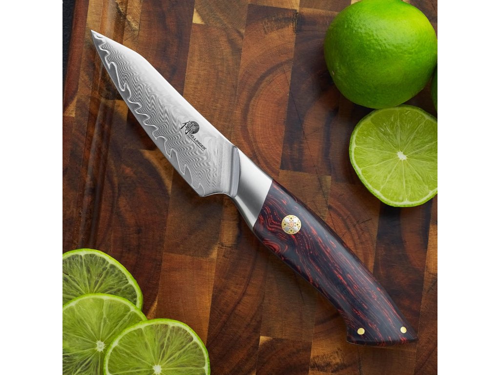 Univerzální kuchyňský nůž Petty Kiritsuke ze série Dellinger Volcano s čepelí s jádrem z práškové oceli 14Cr14MoVNb HRC 62-64, které je vloženo mezi 72 vrstev damaškové oceli. Nůž je ideální na okrajování, ořezávání a zdobení ovoce a zeleniny. Zvládne také přesné řezy nebo špikování masa. Ergonomická rukojeť je vyrobena z materiálu G10 červeno-černé barvy damaškového vzoru s ozdobným nýtem. Délka ostří 90 mm.