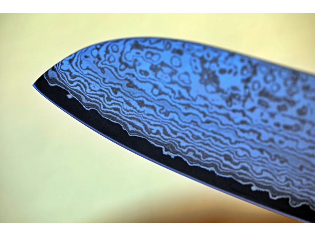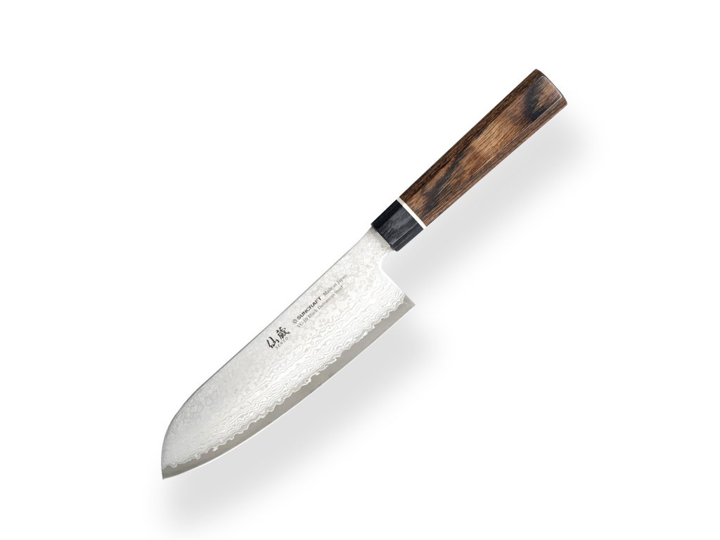 Extrémně ostrý japonský nůž ze série Suncraft VG-10 Black Damascus. Nůž Santoku je bezohledný kuchyňský válečník, který je připraven na všechna vaše přání. Japonské slovo "santoku" se zhruba označuje jako "tři ctnosti", což svědčí o všestrannosti tohoto nožového stylu a druhu řezů, které vyniká (řezání, rozkrájení a mletí). Čepel je obvykle kratší než kuchařský nůž s výrazně odlišnou geometrií. Nůž Santoku je často prohlašován za fúzi mezi šéfkuchařským nožem a Nakiri, což vám přináší výhody obou zmíněných. Vyšší faseta snižuje tření, krájení je tak přesnější. Santoku je dokonalým společníkem při práci s masem, rybami, zeleninou a ovocem. Nepřekonatelné vlastnosti nože oceníte například při krájení cibule. Ostrost čepele zajistí minimální únik tekutiny a vaše pokrmy budou plné šťávy a vitamínů. Široká čepel a příjemná rukojeť vám poskytne tu nejlepší kontrolu při řezání a krájení. Japonské umění, preciznost a nové technologie činí tento nůž z damascénské oceli jedinečným a nenapodobitelným.
