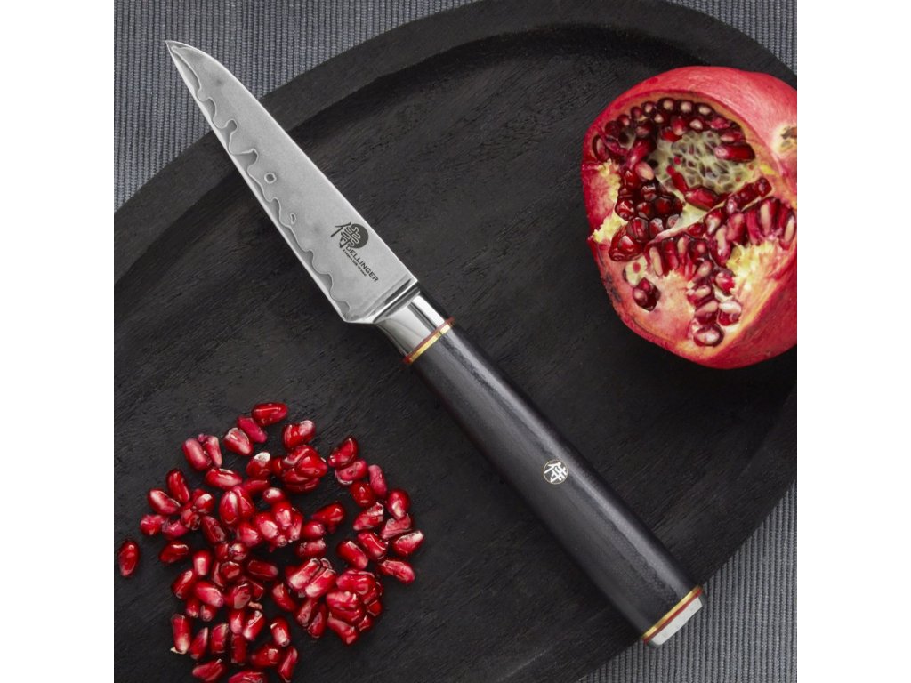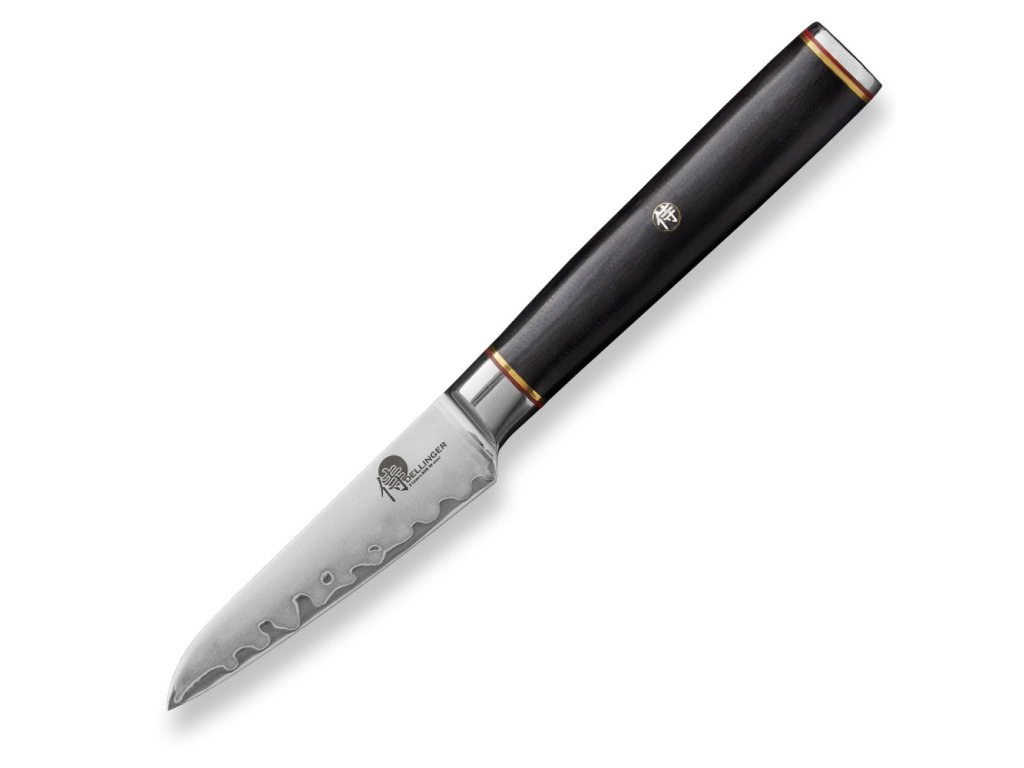 Okrajovací nůž ze série Dellinger Okami 3 layers AUS10 s jádrem z japonské oceli AUS-10 a kulatou rukojetí z materiálu G10 s ozdobným nýtem. Nůž je vhodný pro běžné krájení, loupání a dekorace. Délka ostří 90 mm.
